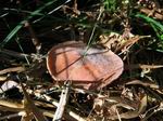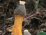 Magnifique champignon, très rare à la Réunion, disposant d'un pied blanc entouré d'une espèce de filet orange qui grandit avec le champignon. Spécimen trouvé dans un champ de canne. Photo Gilbert Moyne.