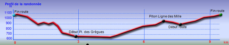 Cette boucle familiale, ou du moins certaines portions qui la constituent, est assez fréquentée par les habitants de la région pour des footings du matin ou des décrassages entre dames, parfois bavardes. Elle est plus facile dans ce sens qu'à l'inverse des aiguilles d'une montre mais permet de varier les paysages rencontrés pour les habitués des circuits des Margosiers ou du Curcuma. On traverse des zones de bois de couleurs mais surtout d'immenses étendues de goyaviers qui permettront, à la saison, de remplir le sac de fruits acidulés en vue de la préparation de bonnes confitures. On a la chance d'apercevoir souvent le village de la Plaine des Grègues depuis le Piton de la Ligne des Mille ou depuis certains points hauts. Le retour emprunte une longue portion de route mais il n'y a pas de raccourci traversant le rein du Piton de la Ligne des Mille. Elle monte constamment et traverse des grands champs de curcuma ou, plus loin des cultures ou prairies.