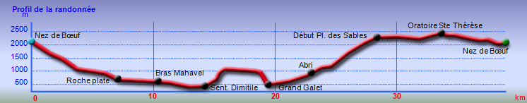 La sortie débute au plus près de la falaise basaltique qui entoure la caldeira formée par l'effondrement de la Rivière des Remparts un peu après le Nez de Bœuf. La descente (ici effectuée de nuit) est rapide vers la forêt domaniale sur un sentier bordé de branles verts. Les portions plates entre les lacets sont rares (Photo 1). Quelques marches en pierre ou encombrées de racines sont hautes et le sol peut être boueux ou glissant par endroits (Photo 2). La pente diminue, les bois de couleurs occupent tout le fond aux alentours de la Ravine Citron Galet. Certains spécimens sont énormes et magnifiques. D'autres créent des arches végétales obligeant à se baisser. Ils font doucement place aux goyaviers qui poussent dru mais le sentier est assez large pour ne pas être gêné. A la saison, il est même très agréable de faire le plein de vitamine C en goûtant les fruits faciles à cueillir. Mais la journée est longue et il ne faut pas trop traîner. La descente est régulière entre goyaviers ou dans les branles. Au milieu de la descente, on commence à voir Roche Plate qui s'éveille (Photo 3). Plus bas, quelques filaos ont souffert du passage récent de certains cyclones mais on s'approche sans encombre de Roche Plate. Juste avant de parvenir au hameau, le sentier est bordé de murets de pierres sèches (Photo 4). Roche Plate ne comporte que quelques cases et gîtes entourés de verdure (Photo 5). La rue principale n'est rien d'autre que le sentier bordé des mêmes murailles sèches. Les 4x4 dans les cours montrent que la piste vient désormais finir au cœur de l'îlet qui a longtemps été isolé par des heures de marche. Les quelques habitations se traversent en quelques minutes et il est trop tôt pour prendre une boisson dans un gîte. Le soleil est maintenant levé et on profite de l'ombre de la forêt de filaos qui se termine au Barrage de Mahavel. Ce barrage est en réalité un amoncellement de gravats et galets issus de l'effondrement d'une partie de la Falaise du côté de Mahavel couvert de plus en plus de filaos (Photo 6). Sur la gauche, l'imposant Rein de Bouc doit être difficile à grimper même en suivant l'arête. Depuis le lit de la rivière, on voit bien l'épaisseur du barrage qui s'effrite d'année en année (Photo 7). Affronter les trois kilomètres qui suivent en employant un maximum de la piste qui redescend vers Saint-Joseph. La vallée est large et il est plus agréable de marcher sur la piste que de sauter de rocher en rocher (Photo 8). Bien repérer le départ du Sentier du Dimitile, difficile à deviner si on n'a pas déjà reconnu ou parcouru ces tronçons. Si jusque là on a marché toujours en descente, la pente de l'Îlet Dimitile va très vite casser les jambes si on part trop vite. La montée est agréable au début mais devient de plus en plus abrupte sur un sentier étroit comportant peu de lacets. C'est en regardant vers la vallée qu'on voit la hauteur déjà parcourue (Photo 9). Les lacets sont rares au début, plus nombreux par la suite. Quelques échelles facilitent les passages rocheux (Photo 10). Une longue ligne presque droite suivant la courbe de niveau indique la fin proche de la grimpette. On arrive essoufflé, sans transition, des bois touffus à la verte prairie (Photo 11). Ne pas manquer, avant de poursuivre, le panorama sur l'aval de la Rivière des Remparts ou celui du Morne Langevin déjà bien éclairé. La traversée du plateau de Grand Coude, relativement longue sur pistes et route, permet de souffler un peu. Prendre le Chemin Théophile Gauthier jusqu'à la supérette et poursuivre par la rue Emile Mussard jusqu'au rempart de l'autre côté. Trouver sur la droite le sentier Tarzan qui relie Grand Coude à Grand Galet. Ce sentier, encore plus pentu que celui pris pour monter à Grand Coude est également difficile à trouver si aucune reconnaissance n'a été effectuée auparavant, mais il y a des cases habitées presque jusqu'au départ et les habitants le connaissent même si peu le pratiquent. Attention aux rochers glissants, aux marches de 80 cm et aux racines qui tiennent moins qu'on le voudrait parfois (Photo 12). Quelques bananiers et cultures annoncent la fin de la descente. Commence alors une montée douce et agréable jusqu'à l'abri de cap Blanc en longeant la Grande Ravine, souvent à Sec. Le sentier passe dans les longoses, dans les cannes fourragères en longeant des cultures ou dans les jouvences (Photo 13). Il reste même des cases habitées qu'on devine au caquètement des poules (Photo 14). Cette randonnée très longue ne permet pas de halte pour admirer bassins, cascades et l'arche naturelle le long de cette rivière qu'on franchit à gué un peu plus haut (Photo 15). La montée vers la Plaine des Sables débute à la passerelle qui enjambe la Ravine des Sept Bras (Photo 16). Le sentier chemine au début dans les chocas (Photo 17) avant d'arriver sous les filaos où il se recouvre de fines aiguilles le rendant glissant. Les pentes sont nombreuses mais encore supportables, surtout sous les filaos. A 1200 m, un panneau souhaite bon courage à ceux qui marchent dans cette direction. Bien profiter des moments plats à Grand Pays car la montée vers la Plaine des Sables est proche et sera plus difficile que depuis la Ravine des Sept Bras. On se retrouve en rive gauche de la Ravine de Grand Sable qui est proche et où le sentier chemine en courts lacets sur les flancs escarpés et parfois éboulés de la petite rivière. Certains gros éboulis ont d'ailleurs mis à mal le sentier à une époque (Photo 18). Les lacets n'en finissent plus mais la température fraîchit au fur et à mesure qu'on prend de l'altitude. On longe toujours la très curieuse Ravine de Grand Sable qui est une longue trainée de basalte (Photo 19). Le sentier balisé de blanc passe même dans le lit de la ravine par de fortes pentes où il est préférable qu'il n'y ait pas d'eau qui coule (Photo 20). La végétation disparaît p