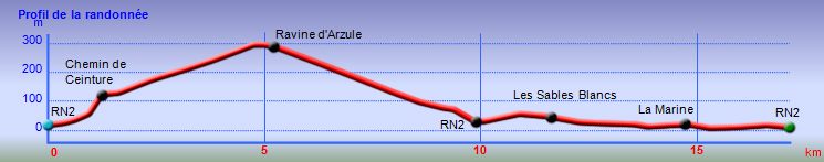 La randonnée débute à l'entrée du village de Mare Longue en venant de Saint-Joseph. Ne pas manquer la visite des deux chapelles proches du sentier au retour. On attaque directement dans les bois par le sentier qui évite d'emprunter la totalité du Chemin de Ceinture ou la route commençant près du Jardin des Parfums et des Epices. Le sentier est facile. Il serpente un peu entre les filaos pour éviter des petites grottes ou effondrements. Sur le côté, impossible à manquer, des pieds de vanille occupent le moindre tronc (Photo 2). En marchant le matin, on peut rencontrer le propriétaire qui vient, muni de son aiguille, pour fertiliser les fleurs du lever du jour. Ils sont rarement avares en explications si on s'intéresse à cette culture et qu'on prend quelques minutes pour discuter ou assister à l'opération. Plus loin, le sentier est assez droit dans une végétation de bois de couleurs des bas. Le sentier, bordé de fougères, est la plupart du temps couvert de lave pour une marche assez facile (Photo 3). Il rencontre le Chemin de Ceinture dans un lacet puis repart vers le nord, toujours dans des sous-bois agréables (Photo 4). Prendre à droite en arrivant la prochaine fois au Chemin goudronné. Très vite, on traverse un petit hameau de quelques cases entourées de jardins fleuris. On bénéficie de nombreux panoramas sur l'océan et la côte boisée de filaos (Photo 5). Les vues sont en général dégagées tout au long de la montée légère sur une route étroite mais agréable et sans circulation. Quelques vacoas (pandanus) poussent en bord de route (Photo 6). Ne pas pénétrer dans la clairière où une vingtaine de ruches accueillent des milliers d'abeilles en plein travail (Photo 7). On est bien sur un trajet pour amateur de route (Photo 9) et de canne à sucre qui pousse ici à perte de vue (Photo 8). Au-dessus des champs dépasse le modeste cratère du Piton d'Arzule, recouvert de forêt (Photo 10). On se retrouve à la verticale de Saint-Philippe qui sera contourné en fin de boucle (Photo 12). On marche à quelques mètres seulement du Parc National et il y a de moins en moins de canne sur la gauche de la route mais beaucoup de bois de couleurs (Photo 13). La route, toujours aussi étroite se met à monter en lacets d'une cinquantaine de mètres, en ne quittant bien sûr pas les cannes. Puis elle reprend une trajectoire assez plate. Après le piton, c'est la ravine qu'on traverse sans s'en rendre compte (Photo 14). D'avoir grimpé un peu avec les lacets, on est plus près du Piton d'Arzule qu'on revoit souvent au-dessus des cannes (Photo 16). La piste se met à tourner à droite à partir d'un lacet. C'est le début de la descente. On voit très bien le point de chute dans la capitale du Sud Sauvage (Photo 17). Il y a toujours autant de canne à sucre mais on rencontre quelques cocotiers et bananiers pour changer un peu (Photo 18). Les lacets de plus en plus longs permettent de descendre sans effort. La route passe près de quelques petites propriétés disséminées dans cette campagne. On franchira six fois cette fameuse Ravine d'Arzule grâce aux nombreux lacets. Elle est parfois assez rocheuse. Une précédente fiche permettait de regagner le lotissement des Sables en traversant les cannes. Certaines pistes étant privées depuis, cette boucle emprunte désormais la totalité du Chemin de Ceinture. En arrivant à la RN2 après cette quinzaine de lacets, il est possible de partir en face par la Rue de la Pompe et raccourcir la boucle. Sinon, prendre à gauche et filer vers Bois Blanc en prenant garde à la circulation. La circulation est beaucoup plus importante et il faut un bon quart d'heure pour rejoindre le lotissement des Sables Blancs, entre la route et la mer. Longer la Rue Isnelle Amelin ou Pierre Bérégovoy jusqu'à la seule trouée rencontrée entre les maisons et y dénicher le petit sentier dans les fougères qui rejoint en une cinquantaine de mètres le Sentier Littoral de Saint-Philippe (Photo 19). Le plus difficile est terminé. Il suffit désormais de suivre ce sentier ou les sentes parallèles des pêcheurs pour regagner Saint-Philippe. Le sentier effectue des zigzags en fonction de la côte très découpée du Sud Sauvage. Les vacoas ont agréablement remplacé la canne à sucre (Photo 20). Près de la mer, les grandes herbes tentent parfois d'envahir le passage mais le sentier est fréquenté et on passe sans problème (Photo 21). Quand la mer semble plus belle qu'ailleurs, délaisser le sentier pour suivre les traces de pêcheurs en direction des falaises. Repérer les souffleurs au bruit du rejet de l'eau par la pression (Photo 22). La mer est toujours forte dans cette région et les vagues créent parfois de belles éclaboussures sur les basaltes de la falaise (Photo 24). Comme souvent dans le sud, on traverse de belles zones couvertes d'un magnifique gazon fin endémique et qui semble toujours tondu de la veille (Photo 25). Le littoral de Saint-Philippe est agréable même s'il ne comporte pas de plage (Photo 26). On parvient à la Pointe de la Mare d'Arzule, tout près de l'embouchure de la ravine qu'on franchit pour la septième fois. Comme la boucle est presque terminée, tenter une balade sur les laves parfois dangereuses du Quai de Carangue ou de la Marine pour dénicher bassins, coquillages ou poissons s'il y a de l'eau dans les bassins. Il ne faut qu'une minute pour rejoindre la Marine, une étroite bande bétonnée permettant la mise à l'eau et la sortie des bateaux de pêche (Photo 27). Tout près également, le monument à la mémoire des disparus dans le naufrage du Warren Astings en 1897. Il ne reste plus que 600 mètres à effectuer. Ils peuvent se faire par la route si la circulation est faible ou par la mer comme dans la randonnée de la boucle du Baril à Mare Longue.