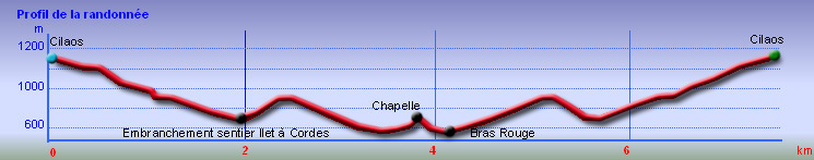 La randonnée peut débuter au plus près du sentier ou plus loin en ville. Pour s'échauffer un peu, il est conseillé de débuter au cimetière où les solutions de stationnement ne posent pas de problème (Photo 1). Il faudra marcher un peu plus mais on n'aura moins de surprises, surtout un dimanche où les randonneurs sont plus nombreux et que tous les emplacements sont pris. La route du Bras des Etangs est facile, étroite et donne de belles vues sur le Piton des Neiges et le Grand Bénare (Photo 2). La randonnée débute par une piste bétonnée, très pentue et chaude au soleil, bordée au départ par quelques cases puis, plus loin, par des champs de lentilles. Le sentier de la Chapelle débute sur la gauche près d'un poteau de l'ONF. On profite également de superbes panoramas avant d'entamer la plongée le long de la Ravine Henri Dijoux. On distingue très bien le Grand Bénare sur la droite et le Dimitile plus à gauche (Photo 3). A l'avant, ce sont les cases de l'Îlet à Cordes qui dominent (Photo 4). Quitter les champs de lentilles et entamer la descente vers le fond de la vallée du Bras Rouge. Le sentier en pente constante dès le départ comporte de gros cailloux et des marches, passe près de petits précipices sans grand danger et serpente sous les grands filaos (Photo 5). Une partie de la descente s'effectue le long de la Ravine Henri Dijoux qu'on franchit aisément de nombreuses fois, abrité du soleil par les filaos (Photo 6). On profite de quelques panoramas sur l'Îlet à Cordes dans les trouées de la végétation. Des petites chutes d'eau mêlées du rouge des racines de filaos ou des bassins viennent rajouter une première touche aquatique à cette balade en descente constante. Après une demi-heure de descente, on traverse une partie plus plate sous les filaos puis on rencontre une bifurcation et le sentier continue vers l'Îlet à Cordes ; prendre à droite la direction de la Chapelle. La montée vers la Chapelle est relativement courte mais assez forte sur des lacets serrés et sableux (Photo 7). Certaines portions en zones d'éboulis sont plus glissantes (Photo 8). La végétation n'est jamais très importante et les bois d'olive l'emportent sur les autres bois de couleurs avant de rencontrer quelques eucalyptus avant la fin de la montée. Plus bas ce seront les chocasAgavacée (cadère) Furcraea foetida - Importé pour en faire de la corde,
