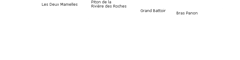 La randonnée débute au parking classique du tour du Grand Etang. Longer les eucalyptus qui bordent l'aire de loisirs puis marcher sur la piste caillouteuse qui rejoint la belle étendue d'eau (Photo 1). La piste monte doucement sur des cailloux dont beaucoup ont été arrachés par les sabots des chevaux. On trouve plus facilement à poser les semelles sur le côté plus herbeux. On s'approche rapidement des berges de l'étang (Photo 2). Les alentours du Puy de l'Etang sont entourés de zones marécageuses. Poursuivre par le large sentier qui contourne l'étang par le nord (Photo 3) et repérer le départ du très discret sentier partant sur la droite, juste en face d'un rein sur l'autre rive de l'étendue d'eau (Photo 4). Le début de la montée s'effectue dans les fougères près d'un pied biscornu de jamrosats (Photo 5). On marche à plat sur une vingtaine de mètres puis le ton est immédiatement donné par la première pente à plus de 75% qui chemine entre les bois de couleurs (Photo 6). Le sentier ne servant qu'aux braconniers, il est assez difficile à suivre mais, avec un peu d'habitude, on le devine instinctivement malgré le nombre des pieds de sabres (Photo 7). Les racines constituent souvent l'essentiel du sentier (Photo 8). Les trouées sont rares et la végétation touffue (Photo 9). L'ancien sentier est encore en bon état par endroits mais sur de courtes distances (Photo 10). La végétation est extrêmement touffue, ce qui permet de mieux repérer le passage (Photo 11). Les épiphytes, orchidées et fougères poussent à même les troncs comme dans toutes les contrées humides (Photo 12). On trouve quelques zones rocheuses qu'il faut contourner (Photo 13). Après une forte montée, on se retrouve près d'une très vieille échelle (Photo 14) qui confirme le bon itinéraire. Elle est rouillée et doit se monter avec attention en fixant bien les mains sur les côtés. Les sabres marrons sont de plus en plus nombreux et on rencontre assez souvent de beaux pieds de palmistes dont il ne faut surtout pas saisir les branches épineuses (Photo 15). La montée continue jusqu'à l'arête d'où l'on bénéficie des premiers points de vue sur les pitons qui dominent l'étang (Photo 17). Mais c'est surtout le magnifique panorama sur l'étang qui fait immédiatement oublier l'effort de la montée (Photo 18). On devine la vallée de la Rivière des Marsouins à travers la végétation (Photo 19). On aperçoit dans une trouée le pylône qui domine l'étang (Photo 20). Poursuivre sur la crête vers ce pylône. A un moment, la végétation est trop touffue ou envahie de fougères et il faut obliquer sur la gauche et redescendre un peu, où se trouvent encore de belles portions de sentier encore en bon état (Photo 21). Le contournement est plat mais il faut immédiatement remonter fortement. Une fois les pylônes atteints, on bénéficie des mêmes points de vue que plus bas (Photo 22). On voit la presque totalité du lac et le regard porte même jusqu'à la côte (Photo 23). De l'autre côté, on distingue correctement la forme caractéristique en tour de contrôle de l'usine de Takamaka (Photo 25). Derrière, à l'horizon, les Deux Mamelles dépassent de l'immense forêt entourant quelques anciens îlets abandonnés (Photo 27). Rien à voir avec les Deux ou Trois Mamelles de Maurice qui se voient de très loin ; celles-ci sont plutôt des mamelons ! Inutile de chercher à poursuivre car la végétation est trop dense à cette altitude et aucun sentier n'y a jamais été tracé. Le retour s'effectue donc par le même itinéraire en prenant garde à ne pas pousser des pierres moussues et instables sur le randonneur qui se trouve en-dessous.