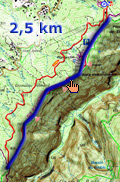 Au virage à gauche du Chemin de la Source, filer tout droit sur le minuscule sentier qui remonte la pente de la falaise vers un élevage de porcs (odeurs) et bifurquer à gauche au premier croisement pour retrouver 300 mètres plus loin les premières maisons et la rue du Puits qui ramène à la RN2. En cas de doute, poursuivre sur le Chemin de la Source jusqu'à la RN (voir carte). Prendre la RN vers Saint-Philippe et marcher jusqu'à la Rue de Terre Rouge.