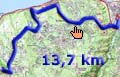 Lecture de la carte : Le trait rouge représente une étape pour laquelle aucune fiche n'est disponible ; en général, de courts transits sur route. Les traits verts et bleus montrent qu'un circuit est proposé sur le site, qu'il a été reconnu et qu'il peut être utilisé sans crainte. Les points jaunes et les lits marquent la fin d'une journée, au plus près d'un lieu d'hébergement
