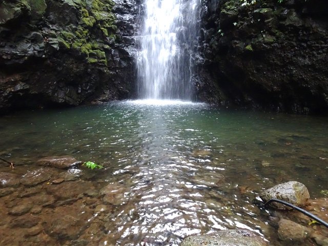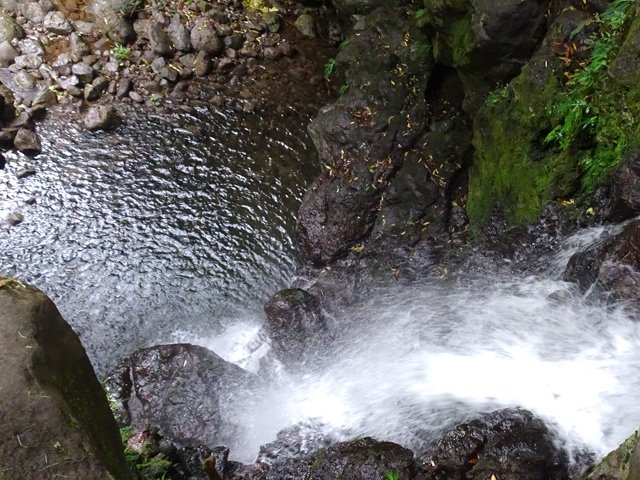Ce microscopique bassin creusé dans le basalte par la puissance de l'eau venant de 600 mètres au-dessus est très petit et profond. On n'en voit pas le fond mais on imagine qu'il y a plusieurs mètres. Quand la cascade blanche est fine, il est possible de se baigner. Lorsqu'elle est gonflée des dernières pluies, on regarde de loin et on ne se met pas à l'eau.