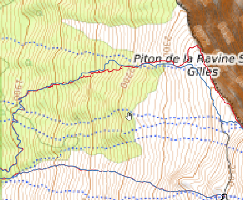 Je montre les différences sur l’image (bleu = trace Randopiton / rouge = parcours réellement effectué). La photo montre le chemin pris, environ 30 m au nord de la trace, à partir de 2250 m d’altitude.