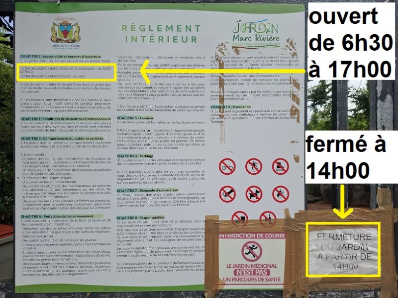 - l'autre (jardin médicinal) fermée par deux portails avec horaires d'ouverture au choix (photos 2 et 3). Fermé le samedi.
