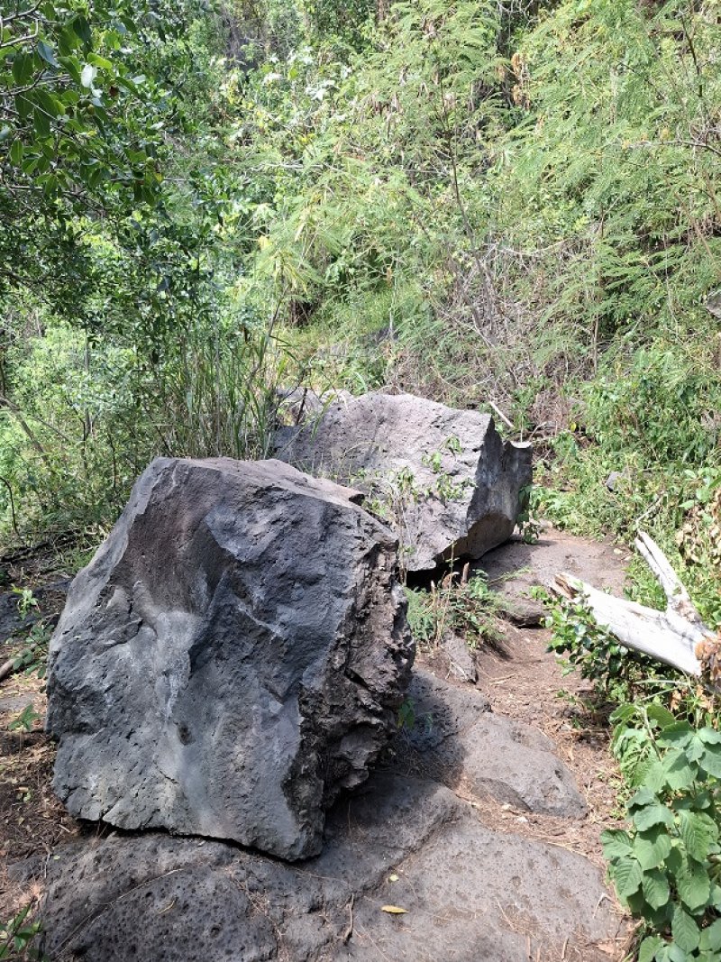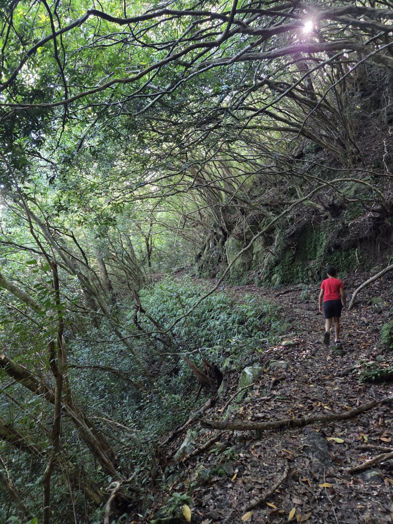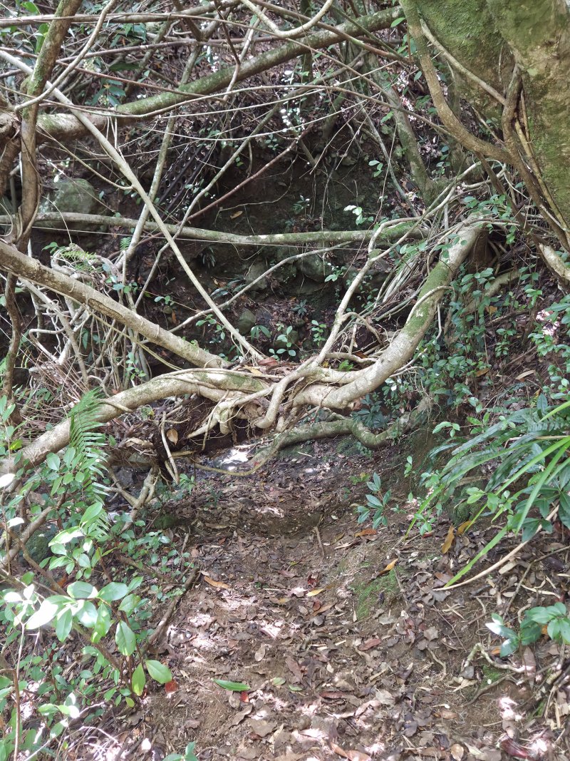 Le sentier est envahi de fougères ou plutôt était envahi. L'escalier en bois de tamarin de la photo 9 n'est plus qu'un souvenir. Quelques vestiges permettent de deviner que nous descendons quelques marches.