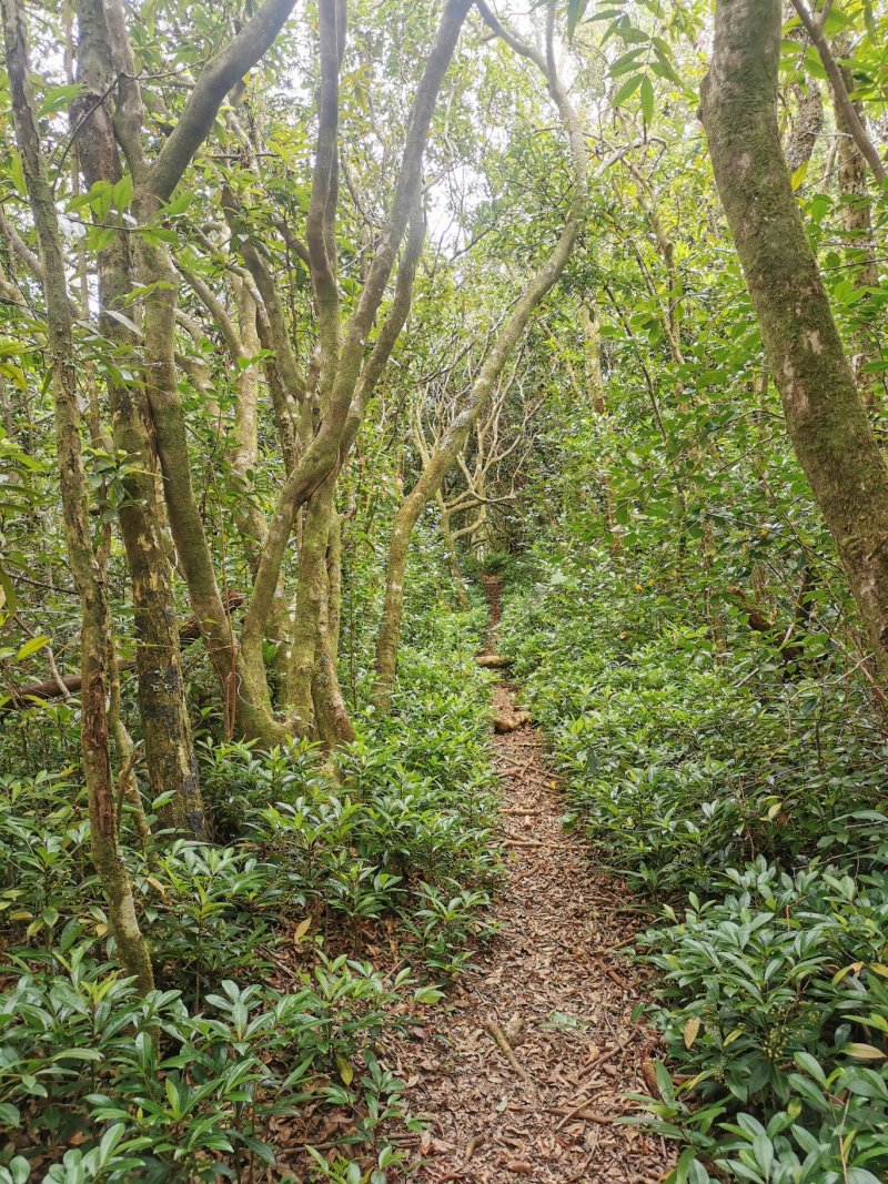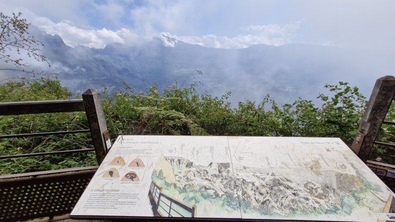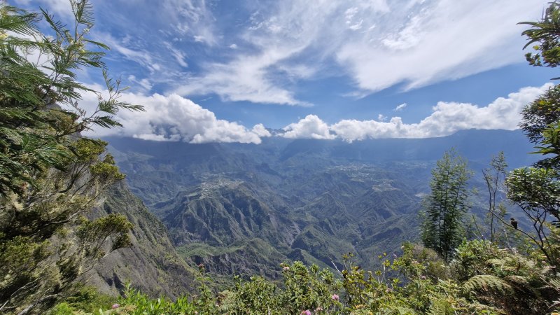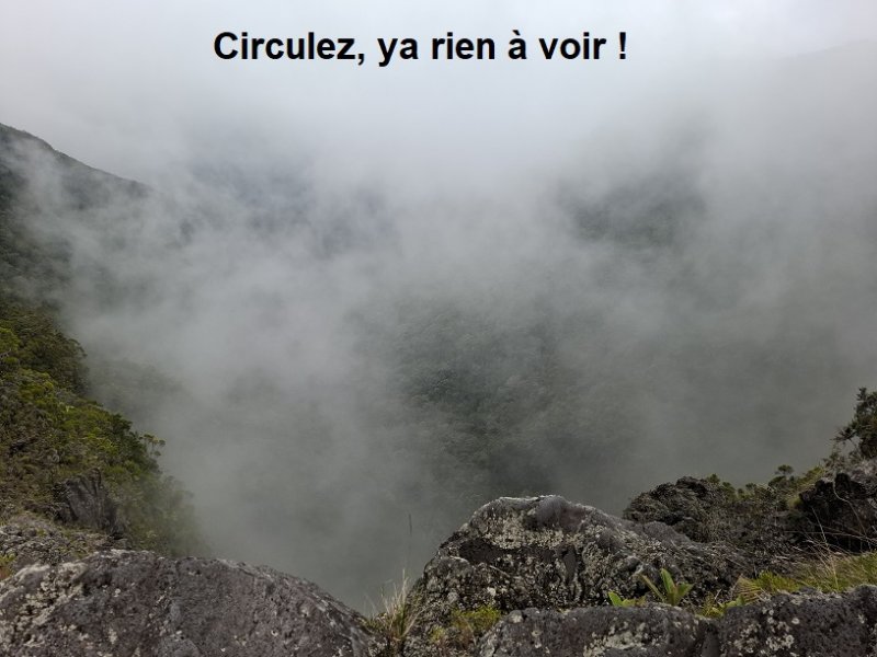 Petit crochet par l’ilet Alcipe, avec vue imprenable sur les nuages (fin de matinée). Retour par le Roi des Tamarins et la RF des cryptomerias.