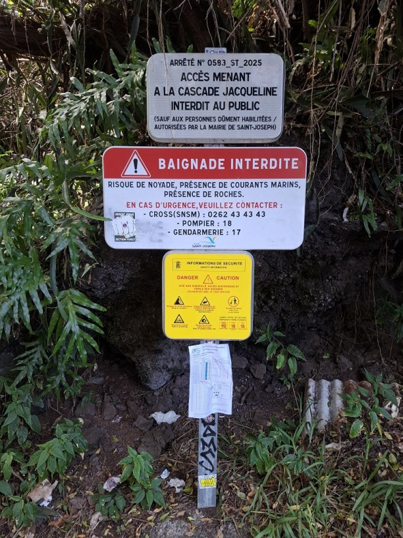 Le sentier de la cascade Jacqueline reste fermé (photo 2) pour diverses raisons : rongeurs (leptospirose), éboulis, courants marins, montée des eaux, noyade et qualité de l'eau.