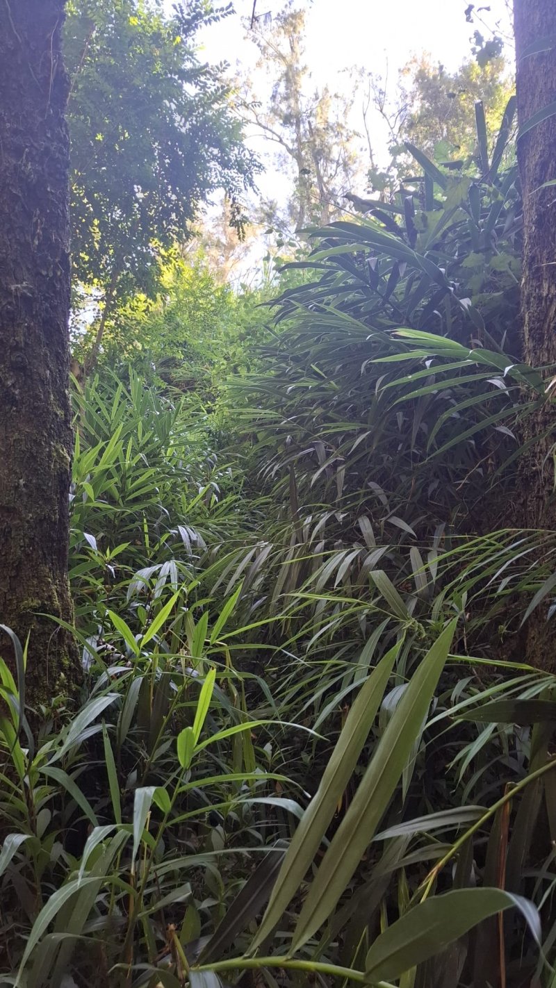 Le début du sentier depuis Montée Sano est bien tracé, on chemine sur une trace assez large bordée de bambous balais, goyaviers, jamroses…