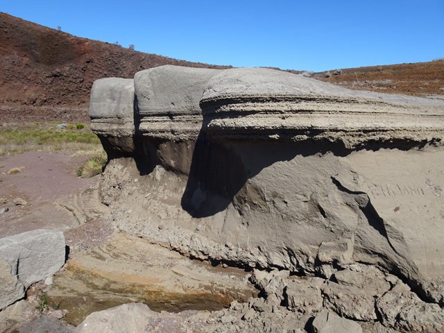 Rare et curieux phénomène d'érosion à la "Colorado" mais sur une surface infime. Les roches restent en équilibre instable et seront emportées un jour par un écoulement cyclonique. Hélas les motards et cyclistes rongent petit à petit ce lieu qui justifie pourtant la randonnée jusqu'au Chemin des Anglais. L'érosion est du même type que Chamarel à Maurice mais sur des terrains différents.