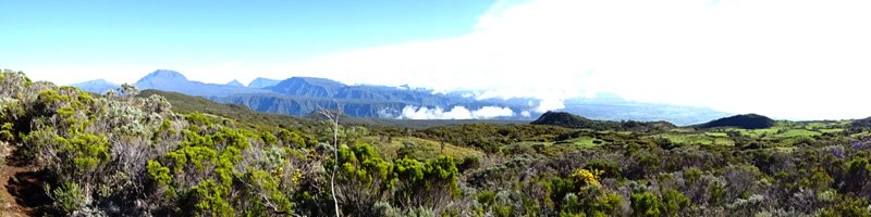 A gauche : Les prairies de BiberonAu centre : Le Piton de la Source et le Piton Rouge. La Fournaise derrière le nuage