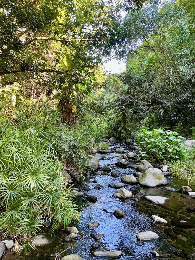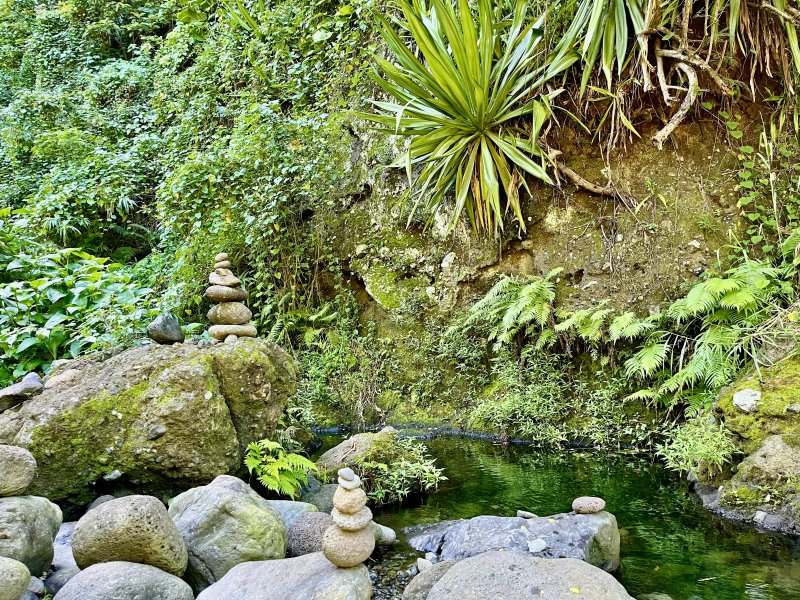 L'office du tourisme de l'Entre-Deux propose 5 circuits courts et faciles pour découvrir la ville et sa région proche. Pour les contrées plus lointaines, il existe les sentiers Bayonne, Jument, Zèbre, Chapelle, Le Doyen et bien d'autres car les pentes du Dimitile sont parcourues par des dizaines de kilomètres de sentiers, tous en très bon état et bien balisés (voir pour cela la carte de la région Sud qui propose une quinzaine de circuits). La courte sortie du Bassin Sassa permet de progresser dans une ravine verdoyante presque au cœur de la ville de l'Entre-Deux. Le bassin, alimenté par une petite cascade (Photo 16), est modeste mais son cadre boisé le rend très agréable. On peut également partir depuis le cimetière du village et on commence alors la boucle par le bassin. Une partie de la boucle s'intègre dans le tour du village de l'Entre-Deux qui utilise justement les sentiers remis au goût du jour par la ville. Les traces de peinture blanche sont fréquentes et on chemine facilement sur le fond de galets, à peine humidifiés par le petit cours d'eau.