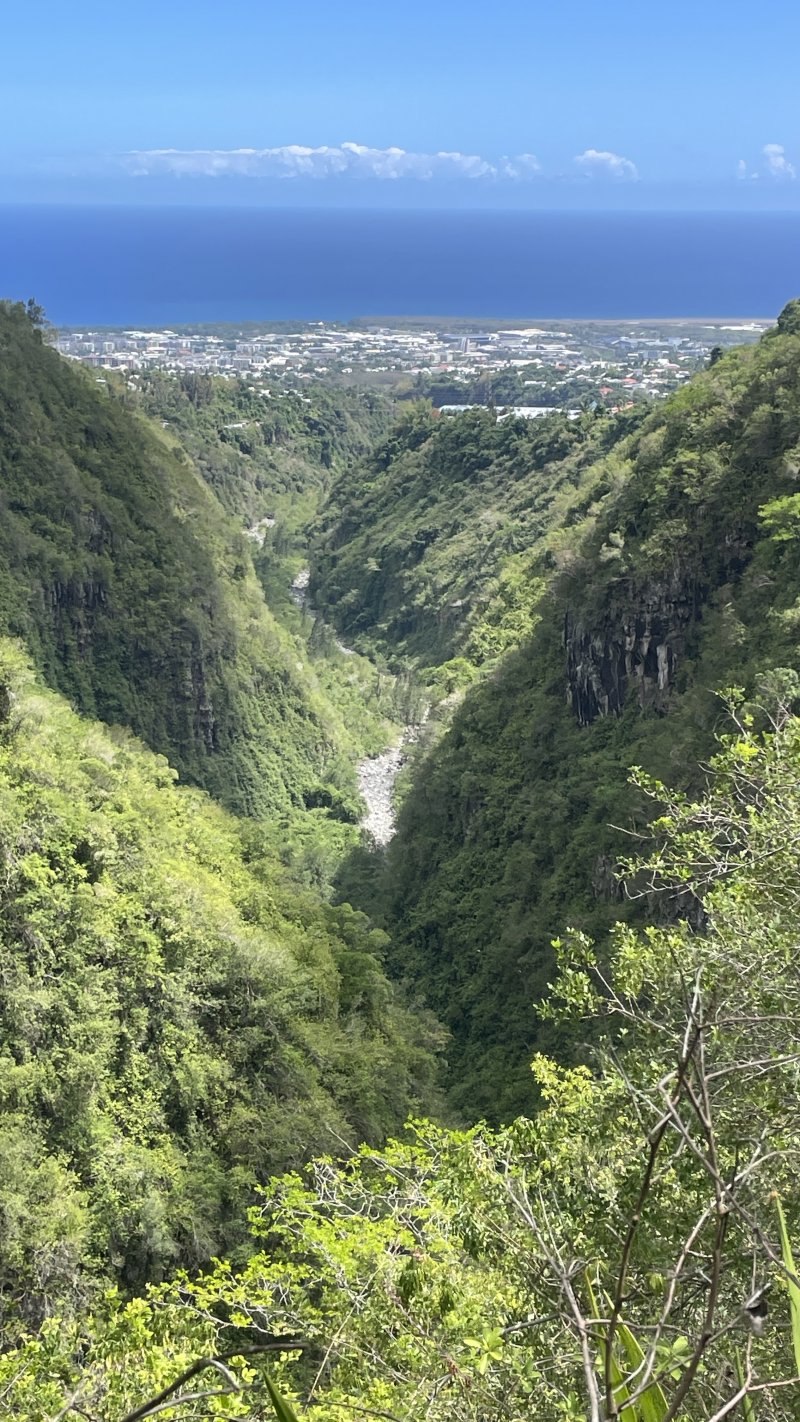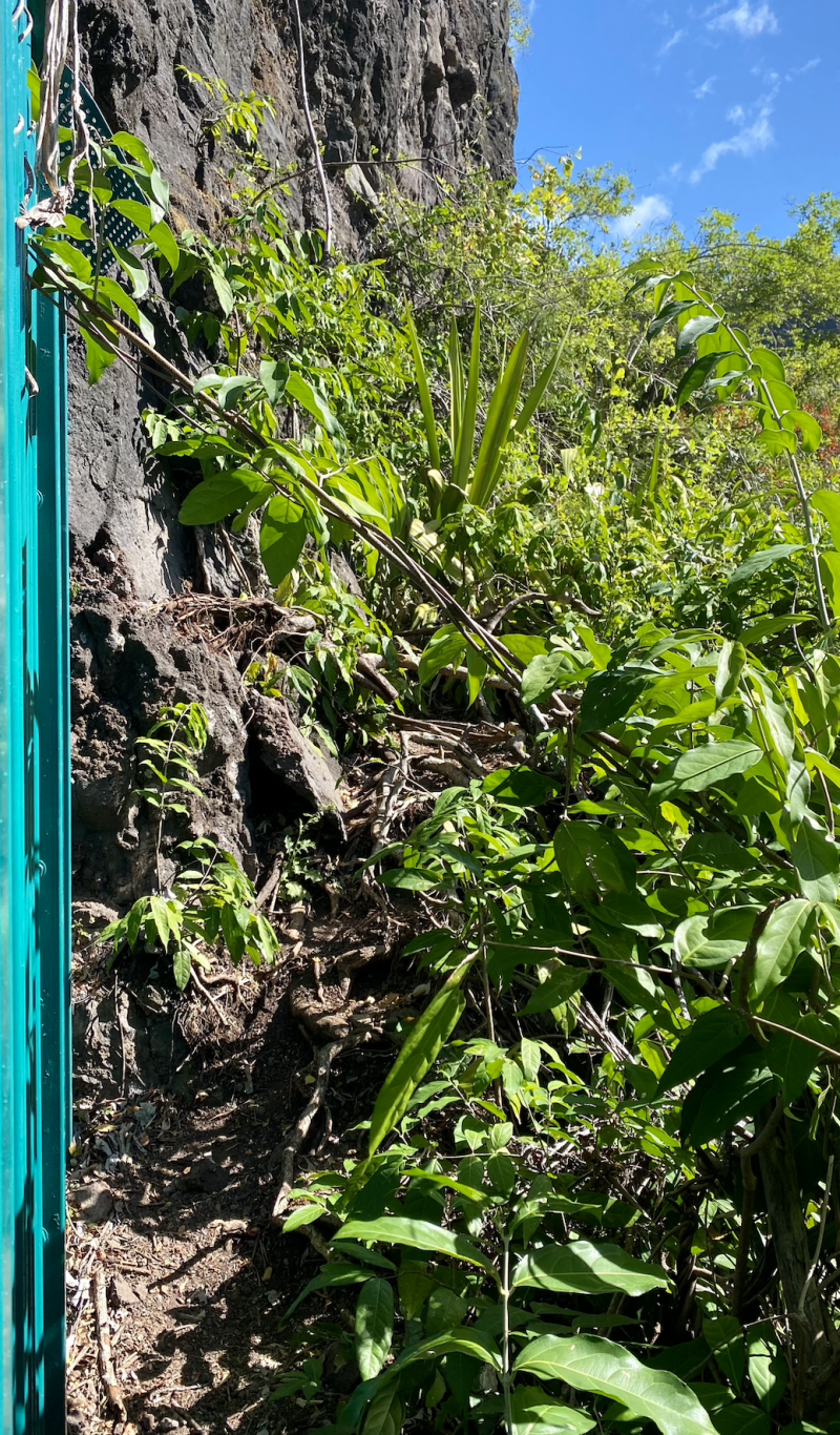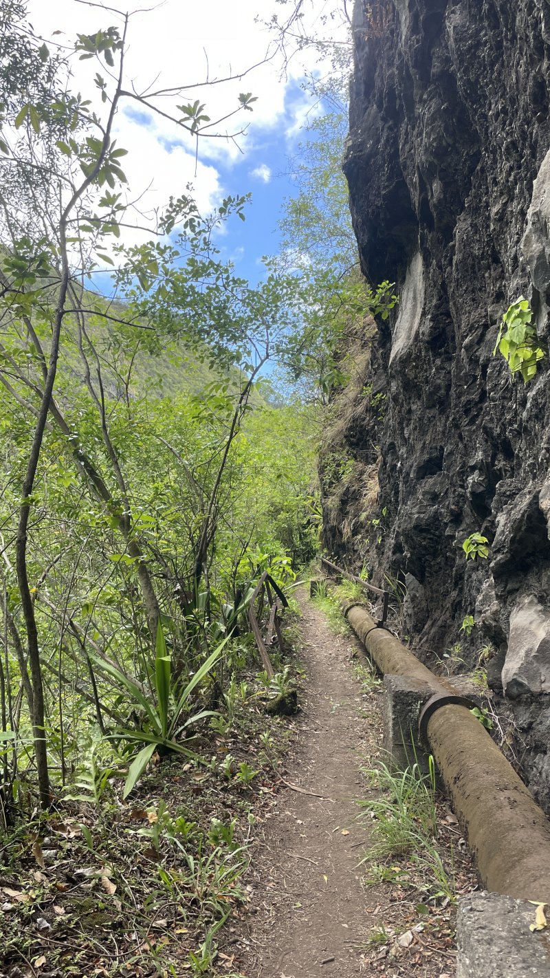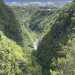 La randonnée débute au petit lavoir qui ne pouvait accueillir qu'une lavandière. Le sentier, un peu envahi de végétation (Photo 1) commence à même la porte et longe la courbe de niveau à travers quelques cases dispersées dans la nature. On profite, avant de partir d'un large panorama sur le chef-lieu et l'océan. La canalisation humide et glissante, percée par endroits et aussitôt réparée, longe le plus souvent le sentier (Photo 2). Pas de difficulté pour le moment. La troisième porte rencontrée depuis la rue est ouverte et invite à poursuivre. Il en va autrement lors de sa fermeture à en juger par les piques et barbelés qui l'entourent (Photo 3). Des trouées dans la végétation offrent des vues sur la vallée vers l'amont (Photo 4) ou vers Saint-Denis (Photo 6). La végétation protège du vide et des tunnels ont du être creusés dans les lianes papillon qui ont pris possession de la falaise (Photo 5). Laisser plus loin le sentier de gauche vers la passerelle qui était fixée à la muraille mais qui est devenue très dangereuse (Photo 1) pour prendre le sentier de droite qui amène à une petite passerelle (Photo 7) puis, plus loin, à un tunnel dans lequel passe la canalisation (Photo 9). La lampe frontale n'est pas obligatoire mais rassure, surtout les grands randonneurs qui pourraient se cogner. Le cheminement se poursuit, toujours aussi facilement, à plat en logeant le tuyau (Photo 11). On distingue très bien le fond de la Ravine du Chaudron dans le bas de la vallée (Photo 12). Certaines portions au-dessus des à-pics de la falaise sont protégées par des rambardes métalliques mais peuvent inquiéter certaines personnes (Photo 16). On s'approche du fond de la vallée et la haute cassure permet de deviner la cascade lorsqu'elle a peu d'eau (Photo 14). Plus loin, près du captage, le sentier est carrément remplacé par la tuyauterie sur laquelle il faut marcher (Photo 18). Attention car l'humidité sur le métal transforme certaines portions en patinoire et oblige à se pencher vers la falaise pour y poser les mains et serrer fortement le câble de sécurité. C'est à cet endroit qu'il ne faut pas amener des enfants. La courte randonnée n'est d'ailleurs pas classée en sortie familiale pour cette raison. Les derniers mètres, toujours aussi près du tuyau, sont assez vertigineux (Photo 19). On entend le bruit d'une chute en aval du barrage et on peut déjà imaginer la longue descente de la cascade du Chaudron. Franchir l'étroit barrage du captage et rejoindre l'autre rive pour atteindre la grande grotte au-dessus du bassin (Photo 22). Les éclats sur le sol et quelques "plocs" dans l'eau claire du bassin expliquent en partie les raison de la fermeture de ce circuit car, si on y rajoute les zones glissantes et celles vertigineuses, la balade peut vite se transformer en tragédie. L'endroit est enchanteur, surtout si un rayon de soleil rend l'eau turquoise et transparente (Photo 28). Les abords se grimpent assez facilement (Photo 27) pour bénéficier de beaux plans sur le bassin et sa cascade (Photo 26). Privilégier une fin de période pluvieuse pour s'y rendre car en temps normal, le filet d'eau est peu impressionnant. Hors saison des pluies, l'eau de la chute provient d'une résurgence au premier tiers de la falaise. L'endroit est tellement magnifique qu'on peut y rester longuement en choisissant cependant un endroit isolé des chutes de pierres, fréquentes. Le retour s'effectue par le même sentier.