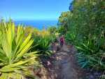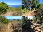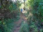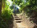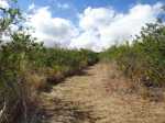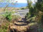 La randonnée débute au parking situé entre Saint-Leu et Cayenne. Rejoindre le hameau dont la rue principale est un escalier étroit remontant rapidement en s'éloignant de la mer (Photo 1). On se retrouve très vite dans la savane constituée d'immenses zones couvertes de zépinards (acacia farnesiana), comme toute la région d'ailleurs. Les parapentistes survolent cette plante épineuse, espérons qu'aucun incident technique ne les précipitera dans ces arbustes peu accueillants. Le sentier grimpe ensuite au milieu de ces acacias par une pente raisonnable et un passage assez étroit (Photo 2). D'énormes roches bordent le parcours et participent, une fois chauffées au soleil, à l'inévitable transpiration (Photo 3). Certaines portions de ce sentier sont sommairement pavées, sans doute à l'époque où il n'y avait pas de route. Les arbustes ne sont jamais très hauts et permettent de profiter des panoramas sur le littoral de Saint-Leu. Lorsque les épineux diminuent, ils sont remplacés par de hautes herbes qu'on n'a peu l'habitude de voir vertes. Un peu plus haut, c'est une canalisation qu'on longe sur un sentier facile. Moins de 30 minutes plus tard, on se retrouve auprès de la Route des Tamarins où la circulation importante est bruyante. Un escalier métallique descend le long de l'ouvrage et permet de se rendre en-dessous. De l'autre côté, le sentier remonte fortement mais il peut être très vite recouvert d'herbe, faute d'entretien (Photo 4). Il grimpe vers le village de Bras Mouton par deux itinéraires possibles. Le premier part à droite à la petite passerelle en bois rencontrée après la RN1 (Photo 5). L'autre, à gauche, sera emprunté au retour. Franchir la passerelle et tourner à droite en longeant le grillage sur un sentier étroit. Les épineux sont toujours là. Le sentier, même mal entretenu se suit sans hésitation et sans griffure (Photo 6). 150 m plus loin, la végétation change un peu autour du sentier toujours facile à suivre (Photo 7). On entend le bruit d'un moteur et l'on se retrouve devant une station de pompage. A partir de là, la montée devient très facile car la piste est régulièrement nettoyée pour permettre aux équipes de maintenir le matériel en état (Photo 8). Certains virages s'approchent de la Ravine de la Chaloupe qu'on surplombe par moments. La pente ne faiblit pas, sans jamais être très forte. Certaines portions un peu plus caillouteuses sont parfois plus pentues (Photo 9). 20 minutes de marche après la passerelle, on s'approche des premières habitations et cultures (Photo 10). La piste (le Chemin des Roses des Bois) devient de plus en plus fréquentée par les véhicules et se transforme en route. La jonction avec la RD13 comporte des pentes plus fortes que sur la piste (Photo 11). On peut souffler en regardant vers l'océan où le regard porte jusqu'à la Pointe au Sel. On quitte le Chemin des Roses des Bois qu'on retrouvera à la fin du prochain tronçon passant par Notre Dame des Champs. Bifurquer à gauche sur la RD13 et marcher jusqu'au début du Chemin Potier. Cette petite route en lacets, sans beaucoup de circulation, est agréable entre bois, friches et champs de cannes (Photo 12). Les allergiques au goudron compenseront en regardant les panoramas sur la côte et l'océan de l'Etang Salé les Bains jusqu'à la Saline (Photo 13). La montée de 45 minutes ne comporte pas de raccourcis pour éviter les nombreux virages. La pente, régulière sur toute la montée, s'accentue un peu à l'approche de la RD3 (Photo 14). La portion de près d'un km pour atteindre le chemin du retour s'effectue en zone semi-urbaine sur de larges trottoirs (Photo 15). Profiter de cette traversée pour repérer les cases ou les jardins fleuris (Photo 16). Les rencontres y sont faciles et très souvent agréables. Ne pas hésiter à rester le temps qu'il faut pour lier de sympathiques conversations avec les habitants. La route franchit quatre ravines avec, chaque fois, de belles vues en direction de l'océan (Photo 17). Après 800 m de RD3, emprunter à gauche l'escalier menant au Chemin des Corbeilles. La jonction avec le sentier passe par des rues étroites et des raccourcis très pentus où les pneus doivent déraper par temps de pluie (Photo 18). Ne pas manquer le départ du sentier dans un virage de la très forte pente du Chemin des Goyaviers (Photo 19). Le reste de la descente ne quittera guère ces sentiers jusqu'à la mer. Le point de départ est un escalier de quelques marches (Photo 20). La pente est toujours raisonnable dans une végétation qui procure de l'ombre (Photo 21). Eviter les sentiers qui partent en direction des propriétés privées en restant constamment sur le sentier principal. Les chocas, de plus en plus nombreux, ne gênent pas la marche sur un large sentier terreux (Photo 22). Il rencontre régulièrement les virages en épingle du Chemin Mutel qu'on évite ainsi sur toute sa longueur. Certaines portions courtes mais pentues ne ralentissent pas les joggers sautant de caillou en caillou (Photo 23). Un peu avant l'arrivée à Bras Mouton, on peut continuer sur l'un ou l'autre des sentiers qui effectuent une fourche. Couper encore des virages au niveau du terrain de sport et emprunter à nouveau des ruelles étroites et pentues (Photo 24). Là également, des escaliers et raccourcis évitent les ruelles entre les habitations. Pour ne pas manquer le Sentier de Cayenne, suivre les flèches au sol apposées lors des dernières courses. Une fois sur le sentier, plus besoin de réfléchir à l'orientation. Le passage est large, très fréquenté, avec toujours de magnifiques vues sur la mer (Photo 25). La pente est rarement forte et cette descente est presqu'une balade sur des sols terreux ou rocheux (Photo 26). La végétation est de plus en plus pauvre au fur et à mesure de la descente, avant de rencontrer les premiers épineux (Photo 27). On entend les véhicules de la RN1 puis on arrive au gué rocheux sur le Bra