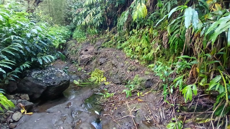 sentier Laverdure fait ce matin. Le sentier se suit globalement bien, il y a juste un doute au niveau du petit méandre (Bras Samy): un sentier bien marqué amène à une zone inextricable, il faut alors revenir en arrière et passer sous une touffe de bambous pour retrouver le sentier. Garance n'a pas fait de grands dégâts sur la zone mais il a érodé une partie du sentier au niveau d'une petite ravine; ça n'est pas particulièrement dangereux pour un adulte mais il vaut mieux ne pas y aller avec un enfant.