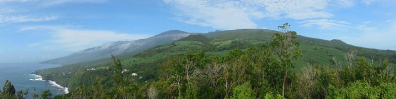 La randonnée débute au petit village de Bois Blanc près de l'arrêt principal de bus. Se rapprocher de l'arrêt et de la petite route en haricot. Le sentier débute juste là et rejoint la mer sur un terrain couvert de pierres de laves moussues et de feuilles de vacoas (Photo 1). Il arrive à un croisement de sentiers. Celui de droite mène en direction du Quai de l'Eglise. Prendre à gauche et traverser la Ravine de Bois Blanc sur un sol très humide et glissant. Poursuivre en longeant le littoral constamment arrosé par les vagues (Photo 2). Le sentier, assez large et ombragé sous les pandanus, passe entre les habitations et l'océan. Quelques bananiers indiquent la proximité du village (Photo 3). On rejoint très vite l'aire de repos et la cocoteraie de Bois Blanc où quelques kiosques (et les moustiques) attendent les pique-niqueurs (Photo 4). Traverser la cocoteraie et franchir plus loin la Ravine Ferdinand puis attaquer la courte mais forte pente qui rejoint en quelques lacets et marches le bord du rempart (Photo 5). Il est bordé de vanille poussant sur des pieds de pandanus (Photo 6). Beaucoup de fougères et de bambous occupent les bords du sentier (Photo 7). Sur la droite, dans les trouées, on devine souvent l'Anse des Cascades qu'on rejoindra après une visite au Gros Piton (Photo 9). Prendre à gauche au prochain croisement de sentier et rejoindre les cannes à sucre poussant le long de la RN2 (Photo 10). Un petit sentier, bien indiqué par un poteau de l'ONF, part en direction du sommet dans les herbes, les goyaviers et les poivriers (Photo 11). On rejoint très vite le sommet d'où l'on bénéficie de superbes panoramas sur l'océan (Photo 12). Un long belvédère attend les curieux, amateurs de splendides panoramas (Photo 13). Un panneau explique que ce piton était le point d'observation des éruptions depuis des générations. Une table d'orientation sommaire donne la position de quelques sommets (Photo 14). Après s'être régalés du paysage, partir par la piste et effectuer le tour complet du sommet par la piste. On contourne ainsi l'antenne relais qui domine le piton (Photo 15). La piste est courte et il serait dommage de ne pas l'utiliser, ne serait-ce que pour profiter différemment des panoramas verdoyants (Photo 16). Après cette courte boucle qui ne prend que quelques minutes, reprendre le sentier et poursuivre celui rencontré au croisement. Il est large et descend par quelques lacets vers la route de l'Anse des Cascades (Photo 17). Une fois à la route, partir un peu à gauche et emprunter le sentier qui descend à la rencontre de celui de Sainte-Rose par de très nombreuses marches. La visite de l'anse en partant sur la droite ne prendra qu'un quart d'heure si on ne connait pas cet endroit charmant. Un raccourci permet de descendre plus vite mais la route est courte. On arrive près d'une cocoteraie sur la gauche comportant des dizaines d'arbres dont les grands troncs semblent mieux résister aux cyclones (Photo 18). C'est sans doute dû à la souplesse du tronc et à l'énorme pied qui le maintient. Une piste cimentée traverse toute la zone afin de permettre aux fauteuils roulants de passer plus facilement (Photo 19). Il ne faut que quelques minutes pour rejoindre une des cascades en utilisant ces pistes (Photo 20). Ne pas manquer de se rapprocher de la plage de galets de l'anse bordée de filaos (Photo 22). Une fois la visite terminée, repartir sur le sentier littoral qui débute par une belle pente sous les vacoas afin de contourner une falaise basaltique (Photo 23). De là-haut, on domine la mer et les roches battues par les vagues (Photo 24). Puis le sentier ondule au gré de la côte et redescend au plus près de l'océan du côté de la Pointe des Bambous où il est possible de se rapprocher au plus près pour y trouver une modeste arche dans le basalte (Photo 25). On aperçoit déjà la coulée de 1977 du côté de Piton Ste-Rose mais il faut se préparer à bifurquer (Photo 26). Le sentier est très agréable dans les fougères sur un sol souvent caillouteux (Photo 27). I faut pourtant le quitter en empruntant le très discret sentier du Quai de Sardine qui repart à gauche en direction du Gros Piton. Quand il est bien entretenu, il n'est pas très large mais est agréable à utiliser (Photo 28). On rejoint en marchant presque à plat la petite route de l'Anse des Cascades. A moins de revenir à l'Anse des Cascades pour un repas au restaurant ou un pique-nique sous les cocotiers, reprendre le sentier pris à l'aller et rejoindre Bois Blanc par le même itinéraire.