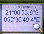 La photographie du GPS montre les coordonnées du début du sentier au cas où il serait difficile de le deviner dans la végétation. Sans le GPS, d'ailleurs inutile sur la portion du Sentier de Bras Cabot, il suffit de guetter, à droite du sentier, juste après un virage à gauche, une trouée dans la végétation. Un simple coup d’œil montrera les traces de chaussures sur les troncs moussus.