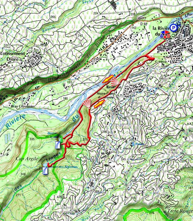 La randonnée débute à l'aire de pique-nique de la Rivière du Mât située au plus près des berges. Un sentier débute à la fin d'une longue "prairie" qui borde un mur d'enceinte de l'usine de plastique du village qui fabrique essentiellement de la tuyauterie pour le bâtiment. On la voit très bien lors de la descente vertigineuse en fin de parcours. Ce sentier est plat, agréable et de bonne qualité (Photo 2). Il longe la rivière et emprunte plusieurs fois le fond ou la murette d'un ancien canal de transport de l'eau (Photo 3 & 4). Il pénètre au niveau du Bras des Lianes dans une belle forêt de bois de couleurs. On rencontre parfois de petites montées pourvues de hautes marches humides. Un sentier vers la droite permet de rejoindre après quelques efforts le bas d'un bassin alimenté par une petite cascade et décrit dans le circuit familial. Quelques montées sous les bambous, puis sous les bois de couleurs et enfin sous de gros manguiers amènent à un nouveau croisement. Prendre à droite et suivre un sentier nouvellement créé qui dirige vers le pied de la Cascade de la Mer. Cette grosse chute (Photo 9) se jette dans un grand bassin d'eau qui paraît très sombre et incite peu à une trempette. Belle occasion d'une courte halte pour se restaurer en vue des nouvelles montées à venir. Après avoir profité du bassin, reprendre le chemin inverse jusqu'aux manguiers puis bifurquer à droite pour la suite de la boucle. De nouvelles volées de marches parfois hautes amènent à une piste qui vient de Bellevue et plonge vers la rivière. La suivre sur quelques mètres vers le Bras des Lianes et obliquer aussitôt sur le sentier qu'on remarque sur la gauche. Il replonge dans la forêt de bois de couleurs, passe quelques petites ravines presque à sec et rejoint plus tard le Bassin des Aigrettes. Ce nouveau bassin, aussi grand que le précédent, est alimenté par une cascade qui tombe en trois paliers (Photo 13) en surgissant de rochers rendus lisses par l'érosion. Les rochers sont tout aussi lisses à la sortie du bassin. Ne pas quitter les lieux sans avoir repéré cette étrange trouée dans le rocher due à l'érosion d'une marmite (Photo 15). Attention tout de même pour l'approcher car le courant est très fort à cet endroit et un faux pas pourrait vite gâcher la journée. Il faut, pour continuer, reprendre le sentier en sens inverse et marcher jusqu'à la piste. C'en est fini avec le bruit de l'eau et les éclaboussures des cascades. Commence la partie qui donnera droit à de très beaux paysages, essentiellement sur le Cirque de Salazie et la Rivière du Mât qu'on domine d'une centaine de mètres. La piste, très bien entretenue (Photo 20), monte en pente faible pour se transformer, moins d'un km plus loin en sentier de très bonne qualité. Comme dans le bas il monte et redescend souvent au gré du relief ou des champs, cultures ou vergers de Bellevue. Il s'arrête d'un seul coup en bordure de rempart pour obliquer à angle droit et traverser le champ de canne pour rejoindre la route étroite de Bellevue. Suivre cette route par la gauche, passer quelques habitations et prendre le premier croisement sur la gauche. Une piste monte en pente raide et une autre herbue part sur la droite. C'est celle de droite qu'il faut emprunter pour retrouver très vite le sentier qui passe également par quelques dents de scie pour enfin plonger vers la Rivière du Mât (village et rivière) qu'on domine (Photo 22). Les marches hautes sont parfois tellement abruptes qu'on apprécie la main courant qui a été installée. On rejoint enfin le sentier pris à l'aller pour retrouver en deux minutes le parking.