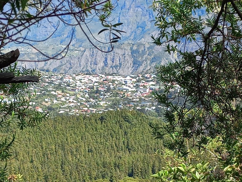 La randonnée débute au lieu-dit Le Bloc qui comporte un arrêt de bus et plusieurs places de parking sous les grand bois de cryptomerias. La solution des transports en commun est souvent la meilleure option en cas de "visite" des véhicules durant la nuit lorsque les randonneurs partent pour plusieurs jours. La montée au Gîte de la Caverne Dufour est immédiate et ne cessera qu'au sommet du rempart. On rencontre tous les types de sentiers de la région avec la terre, la boue, les marches en pierre ou en bois ou quelques échelles. Les faux-plats sont très rares et ne permettent pas de se reposer (Photo 2). Les points de vue sur le cirque sont également assez rares (Photo 5) mais un belvédère en bois aménagé spécialement permet de voir la ville si le brouillard n'est pas de la partie. Sachant que la montée est longue et pénible, chacun prend le rythme qui lui convient. A mi-parcours, le sol est moins pentu car on se retrouve sur le Plateau du Petit Matarum. Une halte est possible sous un abri situé près d'une source rafraîchissante, de quelques tamarins ou cryptomerias (Photo 10). Si on avait bien monté jusqu'alors et que les jambes chauffaient avant le plateau, il faut se préparer à une pente beaucoup plus forte à partir de la Ravine des Prunes. Repérer, en début de grimpée, près de cette petite ravine, les nombreux pieds de noisetiers, un arbuste très rare à la Réunion, sans doute importé à l'époque de la plantation des chênes qu'on retrouve autour du Bloc et de la Roche Merveilleuse. La deuxième partie peut débuter.