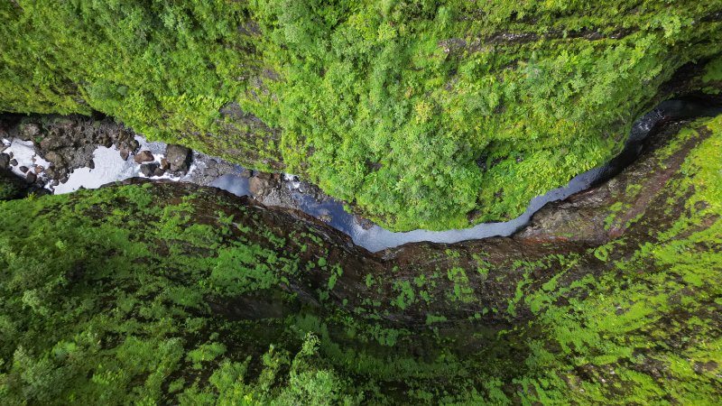 La randonnée débute à l'arrêt de bus du Bras de Caverne, facile à repérer en bord de route entre l'Îlet Morin et Salazie. Une fois garé au plus près de l'ouvrage, il faut en réalité descendre sous le pont et remonter par le fond glissant et rocheux de la rivière (Photo 1). Les chouchous, d'autres lianes et de grandes herbes ont envahi le fond et les abords de ce bras sec se jetant un peu plus bas dans la Rivière du Mât. La vigne marronne n'arrive même plus à pousser car la liane recouvre tout mais ce n'est rien comparé à l'Îlet du Bras de Caverne où on arrivera dans près de deux heures. Le cheminement est lent mais de très courte durée et le début du sentier se remarque sur la gauche après moins de 200 mètres de remontée. La corde qui permettait d'atteindre les premiers bananiers a disparu mais en employant les mains et les troncs de goyaviers, on parvient tout de même à la lisière de la bananeraie (Photo 2). Il faut slalomer entre les troncs qui envahissent le sentier. Plus haut, le sentier pénètre dans les goyaviers et monte en pente douce sur une trace très bien marquée (Photo 3). On rejoint plus haut quelques touffes de bambous à feuilles larges puis la pente débute et ne cessera qu'au col. Des bouts de cordes aident parfois au franchissement de passages plus délicats (Photo 4) mais ne sont pas indispensables. Les trouées sont rares vers le rempart en face ou vers Bois de Pomme (Photo 6). Après quelques passages verticaux sur rochers parfois acrobatiques ou hautes racines on parvient au col marqué par un très modeste oratoire (Photo 7). Les rares offrandes montrent bien que la pente est forte et peu même rebuter les plus pieux. La descente vers le Bras de Caverne est assez dangereuse car le sentier y est encore plus étroit, abrupt et envahi de végétation. Heureusement sa trace reste toujours visible et il est impossible de s'égarer. Les bois de couleurs sont heureusement plus nombreux que les goyaviers (Photo 9) et on rencontre ça et là quelques beaux spécimens qui tentent de résister sur la forte pente (Photo 10). On ne compte plus les lacets, les glissades, les branches en travers mais on parvient enfin à un large coude de la rivière occupé par un ancien îlet dont il ne reste plus rien, si ce n'est une exceptionnelle couverture de chouchous (Photo 12). Entre les brèdes, les fruits de la liane et les anguilles dans le Bras de Caverne, il y a sans doute moyen de vivre ici quelques semaines en autarcie. Repérer le sentier, discrète ouverture dans la végétation qu'il ne faudra pas manquer au retour sous peine de descendre vers la Cascade Blanche (Photo 13). Paradoxalement, le fond de la rivière est très praticable et on peut la remonter sans se mouiller les pieds, en sautant de rocher en rocher (Photo 14). En réfléchissant où poser les pieds, il doit être possible de suivre le bras sans mouiller les chaussures mais il faudra beaucoup plus de temps. Il est ainsi possible de remonter d'un kilomètre en cherchant toujours le meilleur passage (Photo 18). Le Bras de Caverne devient ensuite de plus en plus étroit et bordé de hautes falaises infranchissables (Photo 19). On rencontre de nombreuses cavernes, sans doute à l'origine du nom donné à la rivière (Photo 22). Des pisse en l'air, plus que des cascades, tombent des falaises, venant de petits affluents (Photo 20). Poursuivre la remontée du bras en sautant sur de gros rochers (Photo 25) ou en passant en-dessous (Photo 26), rendant la sortie presque ludique. On parvient à un minuscule bassin alimenté d'une petite chute (Photo 27) et la remontée s'achève un peu plus haut à un bassin plus impressionnant et très difficile à franchir (Photo 28). On aperçoit une corde en haut du rocher mais il faut nager pour atteindre le point de passage, glissant et dangereux qui permet de s'en saisir. L'idéal est donc de se baigner, d'apprécier le lieu ou d'y casser une petite croûte avant de repartir vers l'aval en direction de l'Îlet du Bras de Caverne. Le retour s'effectue par le même itinéraire, tout aussi difficile dans ce sens.