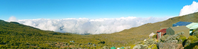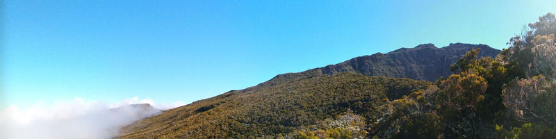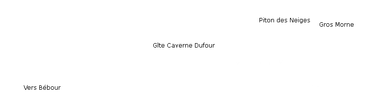 La randonnée débute à Hell Bourg, près de la mairie annexe et suit un chemin entre quelques cases (Photo 1), filaos et touffes de bambous avant de franchir une petite ravine, affluent du Bras des Demoiselles puis de traverser une aire de pique-nique sous les cryptomerias. Le sentier, le plus souvent bétonné, débute un peu plus loin et monte tout d'abord régulièrement dans les plantations domestiquées ou sauvages de chouchous. Il se poursuit sur des marches en pierre bordées de murettes pouvant comporter des câbles de maintien puis sur des cailloux (Photo 5) avant de grimper plus fortement sur des marches bétonnées pour rejoindre le Gîte de Bélouve. Certaines portions comportent des lacets courts et raides, d'autres sont plus agréables. Le sentier se termine à une rambarde en bois près du gîte. Ne pas quitter les lieux sans avoir rejoint le belvédère et jeté un regard vers Hell-Bourg laissé moins de 90 minutes avant. D'autres panoramas seront possibles au fur et à mesure de la montée après avoir franchi la forêt primaire. Plusieurs itinéraires, depuis le gîte, permettent de retrouver le sentier du Piton des Neiges mais la piste qui longe le rempart est plus courte et très agréable. Cette piste, bordée de bois de couleurs et fougères se termine à une installation comprenant une case technique, une grande antenne et un belvédère. On pénètre ensuite dans la belle zone boisée de forêt primaire très humide sur un sentier ou alternent racines (Photo 7), boue, terre, marches en pierres ou en bois. Quelques passages de ravines imposent de redescendre puis de remonter par de courts raidillons glissants. Des passerelles humides facilitent certains passages (Photo 8). Les points de vue sur le Cirque sont moins nombreux qu'on pourrait l'imaginer en voyant la carte (Photo 9). Plus loin, les bois de couleurs et les tamarins diminuent et le sentier, remis en état en 2016, continue ensuite dans les grandes bruyères couvertes de barbes de Jupiter en direction du Cap Anglais. Il faut à nouveau franchir des ravines mais les échelles et les innombrables marches sont plus agréables que la boue de la forêt primaire (Photo 10). On retrouve pourtant cette boue à plusieurs endroits plus plats que les autres. Les points de vue se font plus nombreux sur le cirque et la forêt de cryptomerias de Terre Plate. L'arrivée sur un plateau permet de voir le chemin restant à parcourir en direction du Gîte. Le Gros Morne est à peine caché par les arêtes pointues et blanchies du Cap Anglais (Photo 12). Quelques planchers de caillebotis ou nombreuses marches en bois amènent enfin à la croix de fer du Cap Anglais. Le sentier plonge sur la droite en direction de Terre Plate. Poursuivre vers le sommet en filant tout droit. La Caverne Mussard est très proche du sentier mais les graffitis et les blocs qui peuvent s'en détacher incitent peu à s'y reposer (Photo 15). Les marches salutaires du dernier kilomètre disparaissent et sont remplacées par des milliers de pierres de lave très désagréables car elles encombrent le plus souvent le milieu du sentier et obligent à regarder plus ses pieds (Photo 18) que les immenses panoramas vers la Fournaise et la Plaine des Cafres. La montée se fait moins rude, les cailloux s'espacent et on aperçoit de loin le Gîte de la Caverne Dufour qui sert de repère. Il faut, avant de le rejoindre, passer quelques ravines profondes mais sans difficulté particulière. Une fois le gîte atteint, en fonction de l'heure, choisir de monter au Piton des Neiges ou d'attendre le lendemain matin, très tôt.