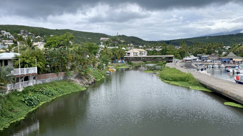 La randonnée débute à l'entrée du Théâtre de Plein Air de Saint-Gilles à partir de la D10. Il vaut mieux stationner le long de la route avant d'emprunter à pied la petite route menant au théâtre. On parvient à une barrière d'où il est facile d'évaluer le chemin à parcourir en repérant Saint-Gilles droit devant (Photo 1). Le panneau situé au départ donne des indications sur les barrages et systèmes de transport de l'eau au XIXème siècle (Photo 2). Avant d'entamer la descente par la large piste empierrée, repérer le sentier partant en direction de la colline. Il est étroit, peu entretenu, mais se suit sans difficulté jusqu'au sommet encombré de roches entourant les installations des antennes (Photo 3). En dominant l'océan de 125 m, on bénéficie depuis les rochers de belles vues sur la région, le théâtre, la Ravine Saint-Gilles ou les vergers (Photo 4). On remarque également le port entouré des habitations blanches de la ville (Photo 5). Rejoindre le point de départ. Il est possible de commencer la descente en allant repérer le kiosque pour le casse-croûte du retour, accessible aux handicapés (Photo 6). Rejoindre alors le circuit principal bordé au début d'une longue barrière en bois (Photo 7). Le chemin, très fréquenté, est large et propre. Il frôle une petite grotte occupée par un "Ti bondié" et se poursuit en descente légère sur un sol de plus en plus caillouteux (Photo 8). Le balisage, parfois un peu effacé, est représenté par des caméléons verts qui ont donné leur nom au sentier (Photo 9). Même tôt le matin, la chaleur peut déjà être importante. On profite de larges panoramas sur la vallée étroite de la Ravine Saint-Gilles (Photo 10). Puis le chemin empierré descend de plus en plus vite sur une forte pente. On le trouve un peu raide au retour mais il est heureusement assez court (Photo 11). On parvient assez vite à de grosses touffes de bambou après avoir franchi une petite passerelle. Avant de poursuivre, on peut partir sur la gauche vers un ancien sentier botanique abandonné. Repérer les quelques panneaux encore en place et continuer ou non vers l'amont de la rivière en suivant un sentier en rive droite. Il passe à un moment dans un ancien canal de transport de l'eau sur un sol très caillouteux. On est très proche de la ravine et de son agréable bruit d'eau courante (Photo 12). Marcher ainsi jusqu'au petit barrage de recueil de l'eau à l'époque où de nombreuses usines sucrières avaient besoin du précieux liquide (Photo 13). Faire demi-tour jusqu'au jardin Bottard en retrouvant les bambous. Il reste des manguiers un peu partout. Des panneaux donnent l'occasion de souffler un peu en lisant les explications ou un poème (Photo 14). Continuer en rejoignant le premier gué constitué de grosses roches pouvant être glissantes après la pluie (Photo 15). On laisse donc le jardin Bottard et ses manguiers poussant à travers les roches pour marcher vers Saint-Gilles (Photo 16). Le petit cours d'eau devient de plus en plus paisible dans les cultures (Photo 17). Les taros et grandes herbes occupent également les berges (Photo 18). On parvient bientôt à un nouveau gué, plus glissant, qui se franchit en quelques secondes (Photo 19). La fin du sentier est toujours aussi facile entre d'anciennes plantations et jardins cachés derrière les haies abritant de vrais caméléons (Photo 20). L'eau stagne presque dans la ravine sur le sol de plus en plus plat (Photo 21). Le pont enjambant la Rue du Général de Gaulle indique la fin proche de la portion sur sentier (Photo 23). Profiter des dernières fleurs rencontrées tout au long du parcours (Photo 24). Les derniers mètres sont bordés de quelques panneaux (Photo 25) avant de remonter vers une aire de repos comportant quelques bancs. Au centre, une grosse baleine bigarrée accueille chaque jour des dizaines d'enfants grimpant sur son dos (Photo 26). Il est possible à cet endroit de faire demi-tour et revenir en direction du théâtre. Si l'on souhaite visiter Saint-Gilles, se diriger vers le port par des allées bordant la berge ou par les routes pour atteindre les ilots que l'on rejoint par des ponts et des escaliers (Photo 27). A la saison, les bateaux chargés de touristes ou de plongeurs partent en direction des baleines ou dauphins nageant au large. Si la chaleur n'est pas trop forte, flâner dans les rues de la petite ville balnéaire et rejoindre par exemple la case Chez Loulou pour y déguster une de leurs spécialités (Photo 28). Il est possible de poursuivre la visite vers la Vierge à une centaine de mètres de là. Le retour emprunte le même itinéraire, un peu plus difficile en raison de la pente sur les marches en pierre.