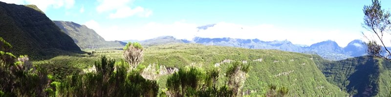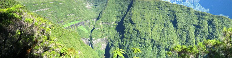 La boucle débute au Coteau Monique où un grand parking peut accueillir de nombreux véhicules. Prendre la route sur 200 mètres et repérer le sentier de l'Ecole Normale qui débute immédiatement dans les cryptomerias par des planchers (Photo 1). Le cheminement est aisé en sous-bois (Photo 2) avant de descendre fortement en direction de la Ravine Mazerin qu'on traverse sans trop s'en apercevoir car sa source, proche du Pic des Chèvres, est à moins de 2 kilomètres. La descente est ensuite constante mais jamais difficile grâce aux caillebotis (Photos 3). La forêt qui borde le sentier est magnifique même si quelques envahissantes commencent à y pousser. On rejoint très vite la piste qu'il faut suivre sur quelques mètres avant de tourner à droite sur le sentier en direction de la Grande Mare. On peut garder le tour de cette retenue d'eau pour une autre fois car la boucle est assez longue et difficile (Photo 4). Une vaste clairière de joncs entoure la mare alors que des centaines de très beaux tamarins s'observent tout autour. Le sentier se poursuit, un peu humide avant de trouver la bifurcation sur la droite pour se diriger vers le Bras des Lianes et l'Eden. La descente est douce, presque plate, tout d'abord sur un plancher puis sur les racines des cryptomerias. On se retrouve sur les gros galets du fond de la Ravine Mazerin qu'on remonte sur quelques dizaines de mètres (Photo 6). Rien à voir avec ce ruisseau traversé il y a moins d'une heure qui a pris de l'importance en quelques centaines de mètres. Longer vers l'amont en marchant au plus facile sur ces gros galets glissants et viser, un peu plus loin, en rive droite, le début du sentier (Photo 8). Aux panneaux discrets et vieillissants prendre la direction de Bras Panon et suivre une ravine à sec au fond couvert de cailloux moussus et glissants (Photo 7). Il ne faut pas s'inquiéter de ce passage obligé par un fond de ravine car, d'une part, il n'y a jamais d'eau et d'autre part, un coup d'œil sur la végétation permet de constater qu'elle est très touffue et difficile à traverser. Quelques portions sont de plus en plus envahies par la vigne marronne (Photo 10). Le sentier sort cependant du lit pour quelques mètres. Ne pas manquer le virage à droite indiqué par une flèche blanche qui prépare psychologiquement au vertigineux coteau qui s'annonce. La flèche étant difficile à repérer, retenir qu'une grotte à quelques mètres de là occupe la rive gauche du ruisseau à sec. La voir indique qu'on a manqué la bifurcation. La montée, parmi les plus abruptes de l'île (Voir profil) est facilitée par de nombreuses et longues échelles en aluminium fixées à une magnifique paroi couverte de plantes et de mousses (Photo 11). Pour les portions sans échelle, les 4 membres seront sollicités ainsi que les branches ou arbustes poussant sur les flancs. Durant la montée, on a un excellent point de vue sur la cascade de la Ravine Mazerin qui se précipite dans le sud du Trou de Fer (Photo 10). Les autres chutes proviennent de sources et de résurgences situées à la même hauteur que celles des voiles de la Mariée vers Salazie (voir l'article de Laurent Michon par un clic sur le rubis de la carte). La fin de la montée s'effectue sur des échelles successives facilitant grandement l'escalade (Photo 13). On parvient au bord du rempart pour revoir la chute de la Ravine Mazerin. L'abri ONF situé au sommet a disparu mais le sentier qui y mène est encore praticable. Prendre à gauche et partir le long du rempart. Moins d'un kilomètre plus loin, en direction de la Forêt des Lianes on a un autre point de vue, plus beau encore, sur les multiples chutes du Bras de Caverne (Photo 12). Le sentier, étroit, encombré de racines glissantes (Photo 16), bordé de mousses dans lesquelles le pied peut s'enfoncer jusqu'à l'aine (Photo 12) ou d'arbres penchés qui nécessitent de se baisser (Photo 19) n'est pas de tout repos. Profiter le plus longuement possible de ce magnifique paysage qui montre le Gros Morne, le Cimendef et la Roche écrite à l'arrière du Trou de Fer (Image utilisée pour la bannière de ce site). En cas de grosse fatigue, réparer un peu la bicyclette abandonnée là et effectuer le retour en prenant garde tout de même à la descente des échelles !! On peut imaginer aisément le geste énervé du cycliste qui l'a jeté ici sans se soucier une seconde de la pollution engendrée pour plusieurs décennies (Photo 18). Le retour est tout aussi difficile sur ces mousses. Il faut remonter au premier point de vue sur moins d'un kilomètre. On a, avant de descendre, de magnifiques panoramas sur la Forêt de Bélouve et le Gros Morne (Photo 21). Vers les échelles, le sentier est vertigineux puisqu'en descente et rendu glissant par les ruissellements. Pour plus de sécurité, veiller à emprunter les échelles, le ventre collé aux barreaux. On suit à nouveau la ravine qui ramène vers le sentier du Mazerin. Reprendre à droite, traverser la Ravine Mazerin puis rejoindre sous les cryptomerias le sentier de l'Ecole Normale. Bifurquer à droite et suivre les planches ou les zones boueuses en direction du point de vue classique installé pour les touristes. Les derniers mètres sont pentus mais les marches nombreuses (Photo 22). On se retrouve sur le belvédère d'où l'on peut bénéficier du panorama le plus classique sur cette curiosité géologique creusée dans la roche par les effondrements et l'érosion. Les cascades ne sont pas moins impressionnantes (Photo 23). De là, après avoir vu ce troisième points de vue sur le Trou de Fer, il ne reste plus qu'à rejoindre le Coteau Monique par les nombreux sentiers qui sillonnent la forêt primaire. La carte ci-dessous prévoit un retour facile par le sentier de l'Ecole Normale puis par la piste et l'allée cavalière avant de reprendre la Route Forestière de Bébour-Bélouve .