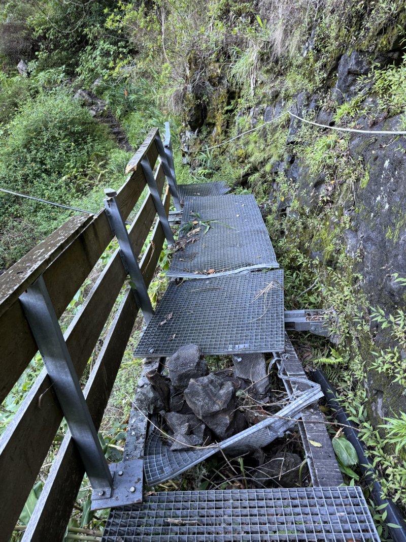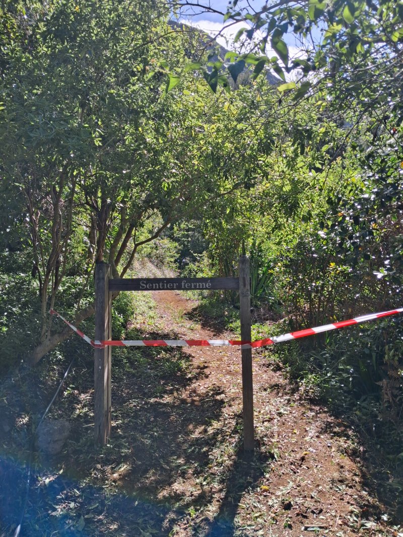 La randonnée débute au parking du sentier Augustave car il est plus agréable de retrouver le véhicule à la fin de la boucle plutôt que d'emprunter la route pour le rejoindre alors que la fatigue commence à se faire sentir. Au petit matin, cette portion de route de 1000 m est éclairée par les premiers rayons qui rendent le parcours fort agréable en profitant des points de vue sur le Cirque de Salazie ou le Gros Morne (Photo 1). Après un lacet serré, le sentier Scout débute sur la droite près d'un panneau (Photo 2). Il est toujours agréable et facile dans une végétation constituée de bois de couleurs, fougères arborescentes et branles (Photo 3). Rien à voir avec le début du sentier Augustave totalement envahi de longoses. Le sentier ondule au gré du relief pour éviter cinq ravines dont le Bras Bémale qui se retrouve rapidement en eau lors des grosses averses. Il faut près de 30 minutes à longer ce sentier sécurisé par endroits et passer les gués rocheux pour parvenir au pied du long escalier qui remonte à Deux Fesses (Photo 4). Il peut impressionner mais il est large et sécurisé d'une longue main courante. Le passage de deux Fesses s'effectue sur une arête étroite dominée par l'imposant Morne de Fourche (Photo 5). On bénéficie alors des premiers points de vue vers Aurère et le Piton Cabris et attention au vide sur la gauche si l'on veut apercevoir le fond du canyon de la Grande Ravine. Le sentier rejoint rapidement le plateau de la Sale, une portion assez plate, donc boueuse parfois, ou encombrée de racines (Photo 6). Un oratoire sur la droite se situe au début d'un sentier abrupt descendant vers la Ravine Savon. Poursuivre dans l'agréable sous-bois jusqu'au rein qui débute la longue descente vers l'Îlet à Malheur (Photo 7). L'arête est plus étroite qu'à Deux Fesses mais l'endroit est totalement recouvert de végétation, dont de grands filaos. Les panoramas sur le Piton Cabris sont grandioses (Photo 8). Les filaos cessent pour un temps et le sentier descend de plus en plus dans les bois de couleurs, branles et goyaviers (Photo 9). Le parcours est parfois technique sur les nombreux lacets, très hautes marches en pierre ou racines en travers. Il faut près de 45 minutes pour atteindre enfin le captage Grimaud, fin des plus grosses difficultés. A partir du réservoir, vide depuis très longtemps, la descente s'effectue principalement entre de gros filaos sur un sentier de qualité couvert d'aiguilles (Photo 10). Cette belle forêt est de plus en plus envahie de longoses, bringeliers et surtout galaberts. La pente est moyenne et l'on arrive rapidement aux premières cultures de 'Îlet à Malheur les Hauts (Photo 11). Le terrain s'assagit aux alentours du sentier partant sur la gauche, sous les filaos, en direction de Grand Place. Le sentier domine un peu l'îlet à Malheur et l'on profite ainsi de beaux points de vue sur les habitations ou le Piton Cabris (Photo 12). Ne pas hésiter à effectuer un petit détour vers le cimetière ou un arrêt à l'épicerie proche de l'église et de l'école. Le paisible îlet est calme, fleuri, donnant immédiatement envie d'y revenir passer une nuit (Photo 13). Une forte descente caillouteuse traverse la Ravine Carreau Chouchou qui mérite bien son nom tant cette liane occupe tout le terrain. Une halte s'impose sur la passerelle dominant l'impressionnant canyon du Bras Bémale (Photo 14) avant d'entamer l'assez raide montée vers Aurère. Elle débute sous les filaos par de nombreuses marches avant de se poursuivre sur un sentier très caillouteux dans les chouchous (Photo 15). Comme le premier îlet, Aurère est un très agréable village à 900 m d'altitude, desservi par plusieurs sentiers plus ou moins fréquentés. Près de l'école et du grand réservoir, prendre à droite, marcher plein nord en profitant des magnifiques panoramas sur la Vallée du Bras Bémale (Photo 16). Prendre la direction du bois de filaos qui domine l'îlet et le traverser sans aucune difficulté (Photo 17). Le sentier débouche sur le Petit Rein, à la fin des filaos (Photo 18). Prendre tout son temps pour traverser ce nouveau rein un peu étroit, surtout sableux et glissant (Photo 19). Profiter du paysage à gauche vers la vallée du Bras des Merles et à droite sur celle du Bras Bémale qu'on va bientôt longer. Le sentier oblique à angle droit et longera pour longtemps le flanc de la Crête de la Marianne en suivant une canalisation. Il est presque plat, pas très large, souvent sécurisé quand il est en corniche (Photo 20). C'est une agréable balade reposante permettant de souffler de la montée à Aurère (Photo 21). Le sentier effectue une boucle du côté de la Source Oiseaux, juste en face du Piton Bémale (Photo 22). Le sentier, toujours aussi étroit et en corniche, bien sécurisé le long des barres rocheuses, frôle des ouvrages bétonnés puis parvient à la passerelle sur la ravine de la Marianne. Les barres rocheuses se multiplient puis on arrive à un premier balcon très bien aménagé pour éviter un passage assez vertical (Photo 23). Le bois est touffu, le sentier encombré de gros rochers et d'arbres magnifiques. Après quelques dents de scie, on parvient, 10 minutes après le premier balcon, en vue du clou de la remontée vers Bord Martin (Photo 24). Nouveau balcon mais comportant cette fois une rude ascension afin de franchir la haute falaise (Photo 25). L'ouvrage, de bonne facture, bien protégé du vide par des rambardes qui diminuent l'impression de vertige, se franchit aisément en admirant toute la vallée du Bras Bémale en aval. Le plus difficile reste à faire. La montée débute vraiment en longeant toujours le petit tuyau (Photo 26). La grimpée traversera à plusieurs reprises le Bras Bémale (Photo 27), franchira de longs pierriers, passera près de belles cascades ou utilisera une demi-douzaine d'échelles et passages artificiels sur un terrain comportant de plus en plus de longoses à mesure