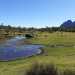 Si l'on prend le temps de se promener sur ce plateau isolé, on remarque que les pâturages sont bordés de beaux tamarins et de fleurs jaunes recouverts de mousse et de barbes de Jupiter (Photo 26). Si le temps est clément, on peut rapporter de beaux clichés (Photo 27). Le sol est plat, les montagnes magnifiques, les animaux calmes ou indifférents. On entend le bruit de chutes d’eau dans les parages et il ne faut pas hésiter à flâner vers le nord, sous les tamarins, pour s’approcher de certaines d’entre elles. Il y a toujours une pierre dépassant de l'herbe pour s'asseoir (Photo 28). Le retour emprunte le même itinéraire à moins de poursuivre dans le cirque, ce qui est le cas de nombreux randonneurs qui profitent d'une traversée de Mafate pour grimper au Kerval.