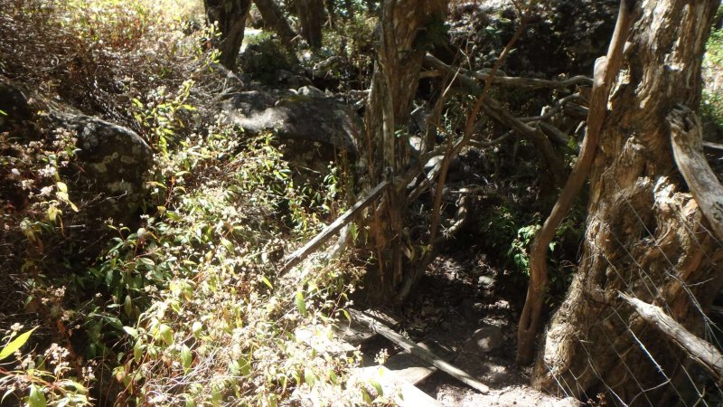 La randonnée débute à la route de l'Îlet à Cordes que l’on peut emprunter en bus. Quelques places de parking se trouvent le long de la petite route en face du départ du Col de Taïbit. La montée est immédiate par des escaliers raides qui surplombent la route. La grimpée jusqu'au Col sera longue et il vaut mieux prendre une allure régulière dès le départ. De nombreuses occasions de contempler de très beaux panoramas sur le Cirque de Cilaos durant la montée puis sur le Cirque de Mafate lors de la descente vers Marla permettent de souffler, du moins le temps de la photo (Photo 1). Le sentier sableux effectue des lacets parfois raides et comporte souvent des marches assez hautes soutenues de rondins ou de planches. Les portions caillouteuses fatigantes pour les chevilles sont assez nombreuses (Photo 2). Ce sont également des racines qu'il faut enjamber en s'approchant de l'Îlet des Salazes (Photo 3). La montée est sportive durant 300 mètres pour atteindre le plateau de l’îlet où une pause est possible. L'abri en bambou a été détruit lors d'un cyclone et c'est dorénavant une tente qui fait office d'abri. A partir de l’îlet, on se repose un peu sans pourtant marcher à plat sur un sentier bordé par endroits de grosses roches tombées de la falaise. La végétation se couvre petit à petit de barbes de Jupiter (Photo 4). La faible montée amène à la Ravine Gobert et ses affluents pour retrouver une forte pente.Poursuivre jusqu’à la Plaine des Fraises pour un répit de très courte durée sur un sentier agréable bordé de fraisiers et de branles (Photo 5). La pente reprend sous le regard bienveillant de la tête de chien qui se nomme en réalité le Nez de Bœuf. Ces branles deviennent parfois la seule végétation traversée (Photo 6). Les lacets reprennent une fois la plaine traversée jusqu'à l'ancien éboulis où le sentier est bordé de rambardes de sécurité (Photo 6). Le dernier raidillon sableux et sans végétation mène à un oratoire avant de rejoindre le Col de Taïbit. Un ultime regard vers Cilaos et la descente vers Marla débute par une pente tout d’abord ordinaire dans les herbes avant de devenir plus délicate et sérieuse en raison du sol sableux, parfois glissant. On a la chance d’admirer, depuis le col, une grande partie du Cirque de Mafate dont le rempart, sur la gauche, paraît interminable jusqu’au Maïdo et vers le Piton des Orangers (Photo 8). On a sous les pieds la totalité de l'îlet de Marla qui est le plus haut et le plus vaste en superficie du cirque (Photo 9). Plusieurs emplacements créés par les centaines d'arrêts photos donnent encore la possibilité de souffler un peu en profitant de ces panoramas. Le sentier est plus étroit et souvent couvert de hautes herbes et jouvences (Photo 10). Le Nez de Bœuf, depuis l'autre versant, a changé de forme depuis la montée (Photo 11). A mi-pente, une zone rocheuse doit se passer avec prudence en raison de l'étroitesse du sentier, du sable qui glisse sous le pied et des sensations de vertige possible pour certains marcheurs (Photo 12). On s'approche ainsi de Marla qui respire le calme et la sérénité même si l'urbanisation guette au pied du Grand Bénare (Photo 13). On passe près de plusieurs gîtes en descendant vers l'école, une épicerie et quelques vaches (Photo 14). En se retournant, on voit les dents du Taïbit, la Tête de Chien vers la gauche et les Trois Salazes qu’on approchera bientôt en montant au Kerval. La chapelle est un petit bâtiment en tôle flanquée de sa cloche (Photo 15). C'est de là qu'on a les meilleures vues sur les prairies abritant les élevages de cerfs. Après la chapelle, on traverse une ravine en eau abritant deux petites chutes avant de poursuivre vers Maison Laclos. Délaisser le sentier partant sur la gauche vers la Nouvelle. C’est au plus près de la Ravine Kerval qu’on rencontre un discret croisement de sentiers. Comme il est peu fréquenté, il est étroit mais se perd difficilement des yeux. Quelques cairns rassurent par endroits. La montée n'est pas de tout repos dans les cailloux et les rochers, dans le lit ou en bordure de la Ravine Kerval, heureusement souvent à sec et bordée de grands arbres (Photo 16). On franchit un portillon de plus en plus délabré censé arrêter le bétail. Le fond de la ravine est assez technique mais les roches tiennent bon et bougent peu (Photo 18). On la traverse à plusieurs reprises et il faut redoubler d'attention. En gardant à l'esprit qu'on ne quitte jamais la ravine, on monte plus serein sans chercher d'échappatoire. Plusieurs fois se présente l'occasion de marcher au plus près sur les berges mais toujours sur des roches (Photo 19). Dans la montée ou en arrivant au plateau, en se retournant, on voit une partie de la vallée que l'on vient de parcourir et une partie du cirque (Photo 20). L'effort est récompensé au bord du plateau car le paysage est magnifique, avec le Gros Morne et les Trois Salazes qui dominent la mare et les tamarins moussus dans la prairie couverte de joncs (Photo 21). Il est possible de se promener à l'envie sur le plateau à la recherche des vachettes, d'un emplacement pour un bivouac ou pour mieux découvrir la région. Une grande partie des pâturages est couverte de joncs, confirmant l'aspect marécageux du plateau (Photo 22). La jonction entre les prairies s'effectue parfois en franchissant des talwegs encombrés de tamarins, fleurs jaunes ou roches (Photo 23). La mare est facile à trouver à l'endroit le plus sec de la région (Photo 24). Il est impossible de manquer les vaches qui se baladent sur le pré ou broutent de concert en levant la tête vers les nouveaux venus (Photo 25).