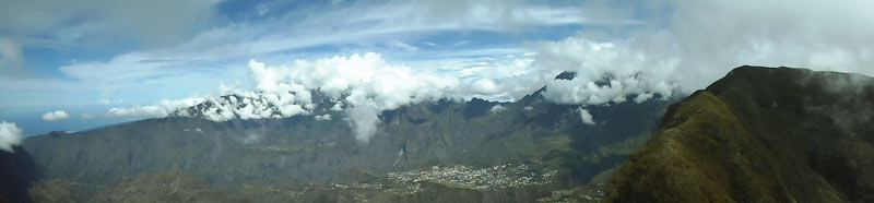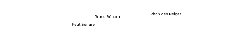La randonnée débute à la barrière qui marque la fin de la route de la Ravine des Citrons où de nombreuses places de stationnement sont mises à la disposition des véhicules ayant parcouru les 10 km de route depuis le village. La montée du sentier Bœuf , maintes fois décrite, est assez courte et comporte quelques petits raidillons de marches avec rondins et racines, surtout en première partie. Le sol, à l'abri du feuillage des grands arbres, laisse le sentier humide et glissant. Les hautes marches sont nombreuses et la pente régulière dans une belle forêt de bois de couleurs (Photo 1). Plus haut, on rencontre une pierre sculptée à un embranchement et le sentier se poursuit sur la gauche. Les acacias noirs remplacent les bois de couleurs. Le parcours est moins sinueux mais tout aussi pentu (Photo 2). Il coupe une première fois la piste puis se poursuit de l'autre côté (Photo 3). Après une nouvelle traversée de la piste, on s'élève en frôlant une case fleurie tout en profitant des points de vue allant jusqu'au Tampon ou Saint-Pierre (Photo 4). La fin de la montée comporte les mêmes pentes jusqu'aux beaux tamarins proches de la piste. Prendre à gauche et rejoindre la chapelle puis poursuivre vers le Camp Marron. A la première piste, prendre à droite et marcher plein nord en profitant déjà de quelques vues sur le Piton des Neiges (Photo 5). La marche facile sur terre amène rapidement en bordure de rempart. On est face au cirque de Cilaos qu'on peut admirer à loisir (Photo 6). On domine surtout Palmiste Rouge qui se dégage lentement de l'ombre du Rempart des Calumets. Délaisser la piste en terre et entamer la remontée du Sentier Jacky Inard où l'on rencontre rapidement la plaque commémorative en granite (Photo 8). Le cheminement ne s'effectue jamais à plat. De multiples dents de scie sont nécessaires pour passer le relief du terrain couvert d'acacias noirs et franchir des ravines invisibles emportées net par le grand effondrement à l'origine des cirques. Le sol est tantôt terreux, tantôt herbeux ou envahi de racines et de marches en bois. On rencontre fréquemment la piste près des belvédères protégés de rambardes pour de nouveaux panoramas. Après le dernier belvédère, la montée régulière se poursuit au plus près du vide à travers des branles et grandes ambavilles. Le sentier est parfois très proche du bord et il faut prendre garde à la chute qui ne pardonnerait pas (Photo 9). On traverse plus loin la longue ligne domaniale comportant un sentier discret servant de raccourci pour redescendre vers l'itinéraire de retour (Photo 10). On a fini le premier tiers de la montée vers le Sommet de l'Entre-Deux. On aperçoit d'ailleurs le Dimitile tout en remarquant la dizaine de dents déjà franchies (Photo 11). Laisser à droite le sentier qu'on prendra au retour et poursuivre sur un sol de plus en plus souvent couvert de pierres imposant de lever le pied (Photo 12). Heureusement, quelques parties plus plates et terreuses permettent de se reposer un peu. On est déjà à une demi-douzaine de splendides points de vue sur Cilaos. Puis, le sentier domine la profonde vallée du Bras des Roches Noires qui annonce les premières échelles (Photo 13). Le cirque et la vallée sont séparés par une étroite crête qu'on rejoint facilement par un sentier caillouteux tout en descente (Photo 14). On devine facilement le sentier remontant vers le point culminant. On se retrouve très vite à la première échelle, la plus impressionnante car très longue et située presque au-dessus du vide (Photo 15). On a d'ici la plus belle vue sur le Bonnet de Prêtre qui semble n'être qu'à quelques encablures. En voyant la pente du rempart et le gros rocher, on trouve salutaire cette échelle qui ne comporte pas de danger si l'on utilise la rambarde (Photo 16). A partir de cette grande échelle métallique, c'est le festival de l'aluminium. Elles sont si nombreuses qu'on en trouve parfois cinq à la suite pour franchir des arêtes rocheuses particulièrement techniques. Entres les échelles, on emprunte de belles portions reposantes à l'ombre des branles même s'il faut toujours monter (Photo 17). La barre rocheuse la plus verticale peut inquiéter mais les échelles fixées à la roche en facilitent grandement la montée (Photo 18). Elle se poursuit sur de belles pentes rocheuses où des câbles aident au maintien. Le rempart côté cirque demeure, tandis que celui des Roches Noires cesse. Le sentier poursuit donc sa traversée des branles verts sans souffrir de l'appel du vide. Un coup d'œil vers l'arrière permet de mieux apprécier les zones rocheuses franchies à l'aide des échelles (Photo 19). Ça n'en est pas fini pour autant car on devine de nouvelles échelles en haut de la pente (Photo 20). Les amateurs d'échelles en alu ne seront pas déçus car il en reste encore quelques unes plus courtes pour franchir de nouveaux obstacles (Photo 21). A 2300 m d'altitude, après 4h30 de montée, on parvient à une zone dénudée, un peu marécageuse bordée des lèvres d'un très ancien cratère (Photo 22). Un sentier sur la gauche longe ce cratère et permet d'atteindre le sommet en 5 minutes pour bénéficier de nouveaux panoramas sur le cirque en dominant cette fois Bras Sec et Cilaos (Photo 23). Au retour, il ne faut que deux minutes pour rejoindre le point de vue sur le Plateau Kerveguen ponctué ça et là de marécages parfois remplis d'eau (Photo 24). Il est alors possible de descendre le sentier escarpé et poursuivre vers la Plaine des Cafres à droite, vers Bras Sec à gauche ou au Piton des Neiges tout droit. La fiche prévoit un retour par le même itinéraire jusqu'au sentier repéré dans la montée. Rebrousser chemin puis entamer la descente et les dents de scie jusqu'à ce sentier. Après une zone couverte de branles, l'itinéraire traverse des bois de couleurs avec parfois de fortes pentes pour franchir la Ravine Pieds de Canne (Photo 25). On tr