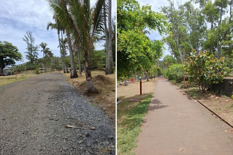 Pour rallonger en longueur et en difficulté, la randonnée débute ici au rond-point de Grande Anse, à deux pas de l'hôtel Palm et Spa. Après avoir stationné près du rond-point, suivre la petite route parallèle à la nationale qui longe les quelques cases du Verger Emery. A la fin de la route, rejoindre la RN puis la longer une dizaine de mètres pour prendre à gauche entre les cocotiers. On rejoint une piste herbeuse qui se dirige vers le bord du rempart. La délaisser pour plonger sur un sentier caillouteux constitué de courts lacets sur une descente assez forte vers la plage (Photo 1). Ce sentier se termine rapidement aux parkings par quelques passages rocheux (Photo 2).