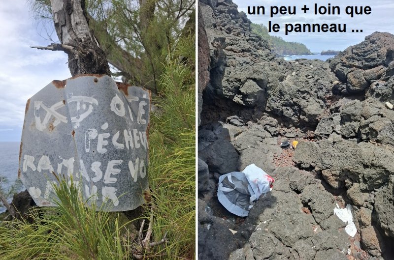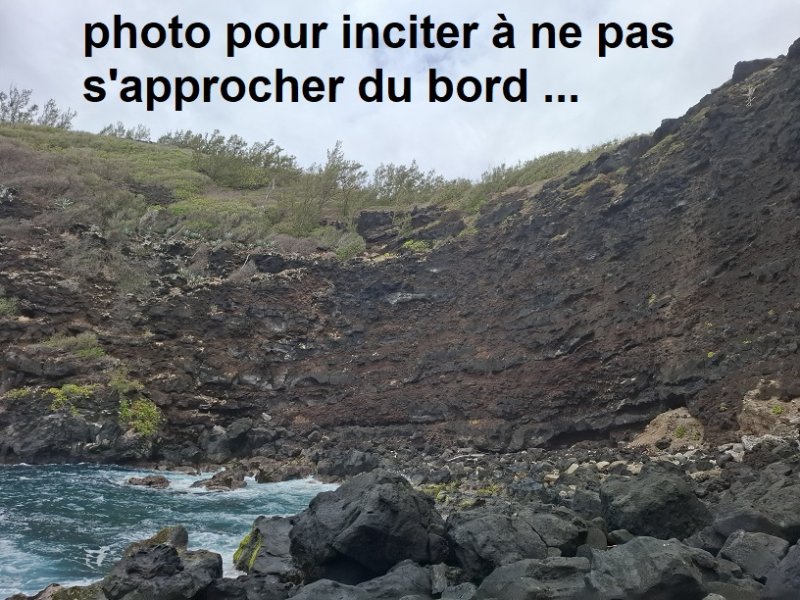 C'est là que commenceront les marcheurs ne désirant pas emprunter ce sentier et traverser le Verger Emery. La première chose à faire avant d'entamer la boucle par la piste est de s'approcher de la plage de sable clair interdite à la baignade (Photo 3). Le cadre, entouré de cocotiers, est agréable (Photo 4). Les pelouses accueillent plusieurs aires de cuisson pour des dimanches en famille. Deux pistes parallèles longent la plage. Emprunter l'une au départ et l'autre en fin de boucle. Elles sont bien délimitées et recouvertes de tuf rouge (Photo 5). Plus loin, le bassin de baignade, entouré de grosses roches qui le protègent des assauts des vagues et des prédateurs peut participer à la détente en fin de parcours (Photo 6). Un ancien four à chaux, bientôt remis en état, trône entre les deux pistes (Photo 7). Poursuivre en direction du piton rocheux qu'on aperçoit devant. Franchir le petit pont sur la Ravine des Français, toujours à sec (Photo 8). La piste, bordée de vacoas (pandanus) devient plus cendreuse (Photo 9). Après une courte descente, on rencontre le sentier qui remonte au Piton de Grande Anse (Photo 10). La montée est raide au départ sur de nombreuses marches terreuses. Un ancien cratère se devine sur la droite (Photo 11). La montée reprend sur les marches en rondins (Photo 12). Les lacets évitent les efforts importants à travers une végétation d'acacias et de chocas (Photo 13). Laisser les sentiers de gauche et arriver au point de vue sur la plage. On aperçoit la plage, la piscine, le parc arboré, le village de Grands Bois et même le Grand Bénare au loin (Photo 14). Poursuivre en descente vers le Cap Auguste sur un sentier plus étroit que pour la montée (Photo 15). Il est bordé de filaos et de raisiniers puis, plus bas, de pruniers de Madagascar. Profiter du spectacle en arrivant au col. Les vagues se brisent de tous côtés sur les falaises. Marcher en direction du sommet rocheux du Cap Auguste. Repérer sur la droite une sente plus discrète empruntée par les pêcheurs. Les aventuriers ne manqueront pas de descendre vers la mer pour voir de petits bassins (Photo 16). Surtout éviter cet aller-retour par forte houle. Le Cap Auguste est une succession de rochers dominant la mer (Photo 17). On peut rejoindre le plus caractéristique d'entre eux en longeant le petit sentier ou en marchant en bordure de falaise à condition de prendre garde. Le rocher esseulé est un excellent point d'observation en direction des falaises volcaniques ou plus bas, vers les vagues, pour guetter les tortues remontant respirer (Photo 18). On peut rester ici longuement pour profiter du spectacle de la mer, des pailles en queue ou des pigeons et pourquoi pas des baleines à la saison. Reprendre le même sentier jusqu'au col puis partir à droite vers un nouveau point de vue par un agréable sentier sous les filaos (Photo 19). Au petit belvédère, nouveau spectacle des oiseaux et des vagues sur le Cap Auguste (Photo 20). Sur la gauche, on distingue très bien l'importante cavité du cratère rongé par les vagues (Photo 21). Le plus impressionnant ici est de voir les pêcheurs à 5 mètres des flots. Ils ont dû descendre la falaise le plus souvent en savates deux doigts ! Poursuivre par le sentier en lacets bordé de pierres volcaniques (Photo 23). La fin de la descente s'effectue sur le petit parking. Partir sur la droite vers un kiosque délabré pour un point de vue sur la Petite île au loin (Photo 24). Le Cap Jaune, constitué d'hyaloclastites, porte bien son nom (voir § ci-dessous). La fin de la boucle est une promenade sur une large piste qui redescend en pente douce vers la Ravine des Français. Bordée de cocotiers, palmiers lataniers et avocatiers marrons, on est assuré de terminer à l'ombre (Photo 25). Passer la rivière par le pont ou le radier constitué de marches et retrouver les pistes rouges du départ (Photo 2626). On peut rallonger de quelques dizaines de mètres en prenant à droite le parcours sportif après avoir passé le four à chaux. L'endroit est tout aussi ombragé (Photo 27). Une fois revenu sur la piste, le sentier qui remonte au Verger Emery est très facile à trouver dans le virage.