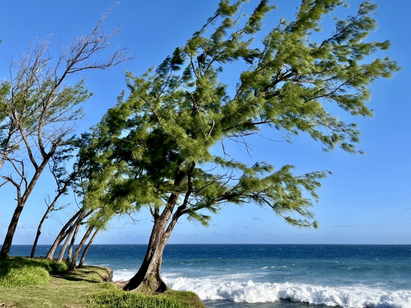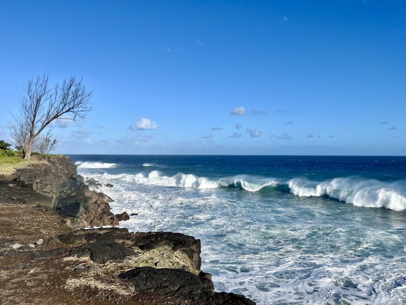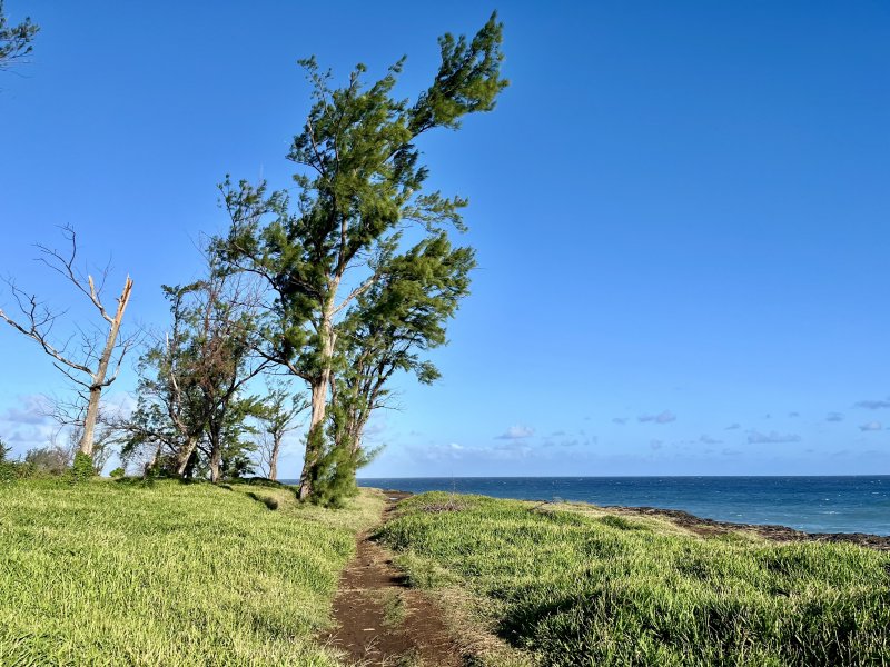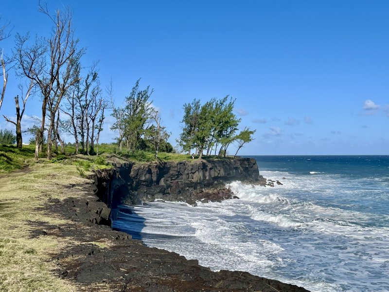 Parcours familial : La randonnée débute au parking situé près de la déchèterie de Saint-Joseph. En raison de la présence de chantiers, la meilleure solution consiste à partir sur la Rue de la Ligne François Martin et trouver, au tout début, le sentier qui part sur la gauche. Après une très courte descente, prendre la piste partant à droite. Cette piste, en bon état et entretenue, longe la rue puis bifurque sur la gauche dans les poivriers et le hautes herbes (Photo 1). Elle tourne ensuite à droite dans les hautes herbes vers la plage avec de nombreux pieds de ricin dans la végétation (photo 2). On parvient rapidement à la plage qu'on peut apprécier depuis le sentier bordé des pancartes d'interdiction. La petite falaise domine la plage très agréable et la Petite Île à l'horizon (photo 3). Si la mer est calme et basse, utiliser la rampe formée par les basaltes et laves pour descendre jusqu'au sable gris. Repérer les falaises équipées par les grimpeurs qu'on peut parfois voir à l'œuvre (photo 4), les cavernes plus ou moins profondes et les coquillages agglutinés sur les roches à quelques mètres de la mer. Si la mer n'est pas trop forte ou qu'elle est basse, la bande de sable est assez large pour rejoindre la suite de la plage (Photo 5). Des grottes plus profonde se trouvent facilement en longeant la falaise (Photo 6). Remonter par le même circuit et entamer la balade vers Saint-Joseph sur le sentier de bord. Il est totalement plat et bordé de grandes herbes au départ. En se retournant, on a de très belles vues sur l'ensemble de la plage et les falaises jusqu'à la Petite Île. Il pénètre ensuite dans un tunnel végétal constitué par les branches de poivriers (photo 8) puis descend en direction du radier bétonné sur la ravine Dominique (photo 9). Deux petits sentiers qui se rejoignant permettent de remonter après la ravine (photo 10). On remarque, de l'autre côté, la falaise qui se fissure et dont les roches ne resteront pas longtemps en place par forte houle (photo 11). Ne surtout jamais grimper sur ces roches pour faciliter leur chute. Le sentier, large et terreux repart en direction de Saint-Joseph dans les herbes. Sur la gauche, on profite de larges panoramas sur les collines environnantes qui dominent les prairies et champs du Lycée agricole (photo 13). Quelques filaos poussent sur le bord mais souffrent du vent et des embruns. Dès que la falaise s'effrite et que les racines sont exposées au sel, les arbres meurent et tombent à l'eau (photo 16). Les lavangères couvrent d'assez grandes surfaces en bordure de falaise (photo 15). Il est vrai qu'elles supportent mieux le sel que les filaos. Le sentier se rapproche au plus près du bord sans devenir dangereux (photo 14). Il s'en éloigne parfois pour s'approcher des champs (photo 17). Le sentier, large et sec est toujours agréable dans les herbes (photo 20). Des petites sentes utilisées par les pêcheurs sont sûres et peuvent être empruntées par les marcheurs. Il faut traverser de larges plaques de laves et de terre avant de parvenir à une minuscule ravine venant du cimetière (photo 21). Elle se traverse sur une petite passerelle en planche et la balade se poursuit vers la ville en s'approchant de la plage de galets qui a remplacé la falaise (photo 22). Marcher jusqu'à une ancienne aire de pique-nique dans l'herbe qu'on reconnait aux anciens socles bétonnés de kiosques (photo 23). La sortie familiale peut très bien s'arrêter là et repartir vers le départ pour rejoindre la plage de Petit Sable pour profiter de son sable gris mais pas de ses vagues dangereuses à plusieurs titres.