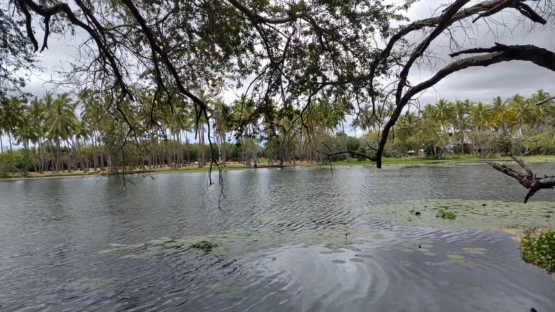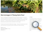 La randonnée débute au parking situé en bordure d'étang à la fin de la Rue de la Croix. Il est vaste, ombragé et très fréquenté toute l'année par les sportifs et même par quelques familles utilisant les emplacements vieillissants d'aires de pique-nique presque abandonnées. Entamer la boucle par la piste partant en direction de l'étang et du pont métallique qu'on devine dans la trouée (Photo 1). C'est l'ancienne voie de chemin de fer qui reliait Saint-Pierre à Saint-Denis, transformée en piste après enlèvement des rails. La longue passerelle métallique au plancher de bois traverse l'Etang Saint-Paul. Repérer, avant le pont, le sentier descendant à droite vers les berges en rive gauche. Les curieux désirant rajouter 2 km à la boucle effectueront le tour complet des queues de l'étang en rejoignant la Chaussée Royale. Un agréable sentier bordé de galets longe l'étang, se transforme en sentier étroit dans les traînasses, rejoint une rue près d'un lotissement que l'on contourne en suivant un grillage avant de retrouver la Chaussée Royale (Photo 2). Partir à gauche sur 400 m de rues en franchissant le pont de l'étang puis le rond-point de Savannah avant de rejoindre le bord de l'étang envahi de jacinthes d'eau (Photo 3). Des emplacements pour pêcheurs et barques de fortune confirment la présence de poissons dont 4 espèces d'anguilles (Photo 4). Il est très facile de longer l'étang dans la prairie qui le borde ou de se promener dans la cocoteraie abritant une dizaine de taphiens de Maurice, des chauve souris grises et blanches d'une envergure de 40 cm passant une grande partie de leur journée pendues sous les feuilles des grands arbres. Solitaires, elles se remarquent pourtant assez aisément en prêtant attention (Photo 5). L'opération amusera assurément les enfants tout en donnant un côté ludique à cet écart des sentiers battus. Quitter les chiroptères et poursuivre en franchissant une petite passerelle (Photo 6). On rejoint en quelques enjambées le parcours venant de la passerelle. Ne pas hésiter à en franchir une partie pour bénéficier de splendides panoramas sur l'étang et les prairies d'altitude au-dessus de Bois de Nèfles (Photo 7). Poursuivre vers le nord en prenant le chemin verdoyant entre les habitations (Photo 8). Il se termine au milieu des fleurs à la Rue Jacquot qu'on emprunte en partant vers la mer. Remonter vers le nord en longeant le collège sur une agréable petite route ombragée et fleurie (Photo 9). On rejoint plus loin la route circulaire effectuant le tour de la Plaine Chabrier après la zone de la gendarmerie. Afin d'éviter de trop marcher sur route, ne pas hésiter à entreprendre la traversée par un sentier bien marqué sur la droite (Photo 10). Le terrain est plat, la végétation rare et les herbes séchées ne cachent pas le passage (Photo 11). Les joggers en ont fait leur circuit de footing et la traversée s'effectue sans surprise (Photo 12). On devine la présence de gros plots en béton qui, à l'époque, maintenaient les câbles tendus de tous côtés pour tenir l'antenne verticale. On bénéficie souvent de larges panoramas sur les montagnes en direction de la Possession ou de Mafate. Une fois la route retrouvée, marcher sur la petite route jusqu'à la barrière fermant l'accès à la base ULM de Cambaie. Quelques mètres après cette barrière, un large sentier file en direction de la plage que l'on devine déjà au bruit des galets roulés par les vagues. Là aussi, pas de question à se poser sur la direction (Photo 13). Les épineux deviennent de plus en plus touffus à l'approche de la plage. Longer galets et sable en suivant les milliers de traces de pas ou de pneus (Photo 14). Trouver la première piste à un panneau du conservatoire du Littoral ayant beaucoup souffert. Quitter le sable gris remplissant les chaussures pour emprunter une piste ombragée où d'importants travaux de défrichages ont été entrepris (Photo 15). La balade s'effectue sous les tamarins d'Inde à quelques mètres de la plage (Photo 16). Elle frôle aussi le talus bordant les galets en offrant quelques beaux points de vue sur le Cap Lahoussaye et le tunnel de la tranchée couverte de Saint-Paul (Photo 17). On s'approche à nouveau de la route circulaire de la Plaine Chabrier mais un sentier permet de l'éviter au plus près du littoral. Quitter la route pour pénétrer sous le couvert des filaos afin de retrouver les pistes fréquentées des sportifs dans le Parc de la Poudrière (Photo 18). Là encore, la marche est un réel plaisir s'il ne fait pas trop chaud (Photo 19). Ce large sentier se poursuit jusqu'à l'embouchure de l'étang d'où l'on peut apercevoir le pont métallique emprunté en début de boucle (Photo 20). Un panneau très intéressant donne des informations de qualité sur la création de l'étang ou sur la faune et l'on apprend la différence entre diadromie, amphidromie et catadromie ! On y découvre également qu'une batterie militaire a été découverte sous le sable de l'embouchure. L'endroit se prête idéalement à une halte reposante (Photo 21). Le sentier repart en direction du pont mais il est très facile de poursuivre sur une trace entre galets et acacias (Photo 22). L'aspect du gué entre mer et étang change continuellement au cours d'une année ; passage les pieds mouillés en période pluvieuse ou gros tas de galets après les fortes houles (Photo 23). Entamer une boucle sur le parcours sportif qui a perdu nombre de ses spots d'exercices mais reste en très bon état (Photo 24). Constamment bordée de galets alignés, la piste est usée par les passages (Photo 25). Il est possible de revenir au point de départ au grand virage sud mais un autre endroit mérite une dernière balade. Rejoindre le trottoir, traverser la petite ravine en marchant vers Saint-Paul et entamer une nouvelle boucle très bien entretenue, identique au parcours sportif (Photo 26). En arrivant près du CREPS, faire