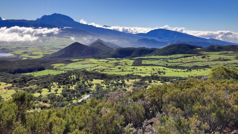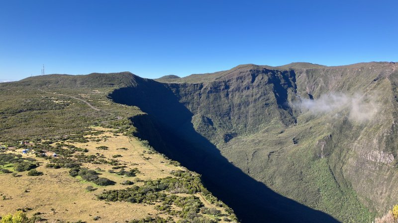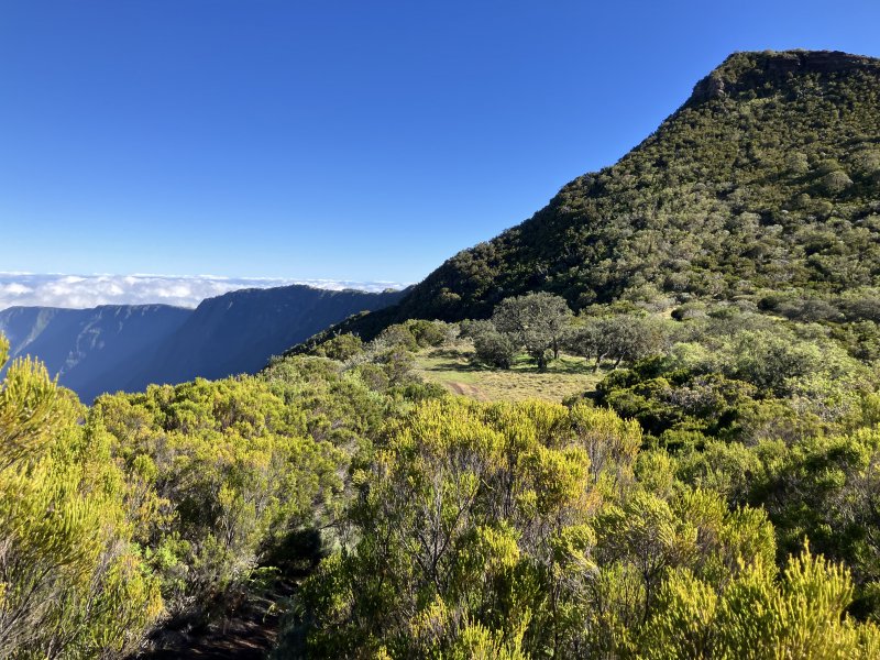 La randonnée débute à l'aire de repos très connue du Nez de Bœuf où les emplacements sont nombreux. Il est préférable de grimper immédiatement au sommet de Nez de Bœuf tant que la météo est clémente. Le sentier débute au plus près de la route par une courte mais forte montée. Il suit la crête séparant la route du volcan et l'aire de pique-nique. Plus loin, en arrivant sous les petits tamarins, on coupe le sentier se dirigeant vers les Trous Blancs. Poursuivre jusqu'au sommet du Nez de Bœuf par une pente moyenne comportant quand même quelques courts raidillons. Seuls les 30 derniers mètres méritent un peu d'attention à cause du vide et du sol glissant (Photo 1). Une fois sur la plateforme cimentée du sommet, il est difficile de songer à la descente car les paysages alentour sont à couper le souffle. Les plus impressionnants donnent vers la Vallée des Remparts et Roche Plate (Photo 2), les plus champêtres vers les prairies de la Plaine des Cafres (Photo 3), les plus sauvages sur la plaine qui entoure le Nez de Bœuf (Photo 4). On peut même profiter de cette halte pour imaginer la randonnée que l'on va effectuer en devinant le nom des petits sommets. Entreprendre la descente sans glisser jusqu'au croisement du sentier des Trous Blancs. Bifurquer à droite, descendre par le GRR2 vers la petite plaine accueillant l'aire de repos. La traverser avant de franchir la route du Volcan et d'emprunter le sentier qui mène au Lac Argamasse (Photo 5). Que l'on prenne le sentier ou la piste récemment rénovée, il faudra rapidement prendre à droite dans les branles verts puis poursuivre sur un sol creusé le plus souvent par les nombreux passages. Le sentier est soit étroit dans les branles et ambavilles, soit creusé dans le sol, soit large et sableux (Photo 6). Il traverse plus loin un joli bois de petits tamarins et de branles blancs pour une agréable marche à l'ombre (Photo 7). Les points de vue sont omniprésents et il faut s'habituer à ne pas quitter des yeux le Piton des Neiges et les autres plus grands sommets de l'île. On traverse quelques clairières au sol herbeux ou rocheux. Laisser une bifurcation de sentiers puis poursuivre jusqu'à une courte portion rocheuse. Ne pas manquer le discret sentier partant sur la gauche dans les branles verts au pied des roches recouvrant une partie du sentier (Photo 8). Si on le manque, ce n'est pas grave puisque le sentier principal mène également au lac. Il comporte quelques marches par endroits en grimpant sur le flanc sud du cratère entourant le lac (Photo 9). Il rejoint un peu plus loin le sentier venant du Chalet des Pâtres par le Piton Rouge et le Piton des Herbes Blanches. Partir à droite et entamer la descente vers le Lac Argamasse, tari en cette période de sécheresse (Photo 10). Longer le sentier entre le lac et la végétation. Trouver un des trois sentiers étroits montant vers le sommet à travers la végétation touffue, la trace se distingue encore bien (Photo 11). On bénéficie des plus beaux panoramas sur la Plaine des Palmistes (Photo 12) et sur le lac lui-même. Les amateurs poursuivront sur la trace qui longe la ligne de crête, sinon, faire demi-tour puis descendre vers le lac. Il est possible d'en faire le tour en prenant garde de ne pas glisser ou s'embourber dans le marécage qui entoure la petite étendue d'eau (Photo 13). Reprendre vers l'Est en direction du Piton Textor, impossible à manquer avec ses grandes antennes installées à son sommet (Photo 14). Quelques parties terreuses, rocheuses et des lacets courts permettent d'atteindre sans difficulté le sommet couvert d'antennes. Rejoindre la piste, prendre à gauche puis suivre le grillage de clôture pour arriver à la zone de décollage des parapentes et aux superbes vues sur la Plaine des Palmistes. L'itinéraire contourne le grillage et le petit mur d'enceinte puis pénètre dans une végétation facile à passer. Il rejoint plus bas la large plaine herbeuse entre les Pitons Textor et de Caille. Franchir la ravine et marcher en direction du Piton Doré sur un sentier très agréable dans les petites herbes. On longe les flancs du Piton de Caille qui baissent au fur et à mesure de la progression. On a encore les antennes comme repère en marchant sous quelques petits tamarins (Photo 15). Quand le terrain est presque plat, trouver sur la droite un sentier discret débutant dans la végétation. Il est parfois très bien marqué, parfois difficile à suivre mais on distingue devant soi les première pentes descendant vers la prairie qui en occupe le fond. Prendre à droite dans la végétation, traverser un petit bois de tamarins puis trouver le meilleur passage pour atteindre le sommet (Photo 16). Les randonneurs peu habitués aux hors sentiers devront toujours chercher les passages créés par les bovins même s'ils ne viennent plus sur le piton, mais une grande partie de la montée s'effectue sur une trace très visible. On passe au plus près de grands tamarins qui n'ont pas résisté aux incendies de 2013 mais créent de belles natures mortes (Photo 17). On peut sans danger parcourir l'ensemble de la crête et se régaler des nouveaux panoramas offerts depuis les 2184 mètres du sommet et des vues sur le centre du cratère recouvert d'herbe (Photo 18). Après avoir effectué un long demi-cercle à suivre l'arête, repérer au pied du Piton de Caille la route passant au sud (Photo 19). Redescendre à l'instinct en visant cette route forestière qui relie les prairies du Piton de l'Eau. On peut passer n'importe où sans danger, que le sol soit dénudé ou recouvert de courte végétation (Photo 20). On arrive près d'une ancienne carrière d'extraction ou le long d'une petite ravine avant de rejoindre la piste. Marcher sur le sol poussiéreux sans crainte de voir passer un véhicule (Photo 21). Rejoindre la route du volcan ou traverser la prairie pour rejoindre le petit sentier qu'on devine dans la montée au Piton de Sable. La tr