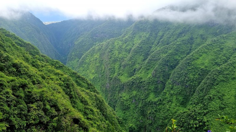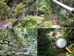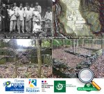 La randonnée débute au bord de la Route Forestière de la Plaine d'Affouches qu'il aura fallu suivre durant plusieurs kilomètres avec le véhicule mais sur un sol correct et carrossable, ne comportant que de rares nids de poules. On ne peut pas manquer le sentier venant du Colorado, bien visible, à gauche de la RF, à ses 1000 mètres d'altitude. Plusieurs places de parking sont prévues pour d'éventuels départs depuis ce point. La portion de route qui suit est longue et poussiéreuse (Photo 1) mais traverse d'agréables paysages permettant également de beaux panoramas de tous côtés (Photo 2). Dans les virages proches du rempart, on a sous les yeux une bonne partie du trajet à effectuer sur piste (Photo 3). Plus on monte et plus le Gros Morne dépasse à l'horizon (Photo 4) tandis qu'on s'éloigne du port aperçu à l'horizon (Photo 5). A l'approche du kiosque d'Affouches, repérer la crête du rein qui descend en direction de l'Îlet à Guillaume (Photo 6). C'est là qu'on rencontrera les échelles pour franchir les parties difficiles. A partir du kiosque, se méfier des cailloux qui peuvent tomber de la falaise après la barrière. Un sentier a été créé pour ce contournement. Pour cela, partir à droite après le kiosque, monter un raidillon et marcher en direction du Piton Fougères. Emprunter ensuite le sentier à gauche au premier croisement puis rejoindre la route par quelques marches dans une végétation fournie. Les "risque-tout" qui veulent encore passer par la route se méfieront des mini-éboulis, surtout en période humide qui facilite le détachement des pierres. La route forestière devient de plus en plus tortueuse, rajoutant du kilomètre sans augmenter l'effort car elle est assez plate. Après plusieurs lacets sur la piste qui devient de plus en plus herbeuse (Photo 7), on traverse le Bras Guillaume et la piste oblique vers le rempart qu'on devine derrière la forêt de cryptomerias (Photo 9). Moins d'un km plus loin, on rencontre le sentier de la Roche Ecrite dans un lacet au milieu d'une végétation comportant de très hauts fanjans (Photo 10). La Roche Ecrite se rejoint en partant à droite mais la distance est encore grande pour parvenir au gîte. Prendre à gauche vers l'Îlet à Guillaume et traverser la forêt de cryptomerias bien plus ombragée que ce que l'on vient de parcourir (Photo 11). La forêt de bois de couleurs prend le relais mais les goyaviers ont débuté leur colonisation (Photo 12). La pente n'est jamais très forte, des lacets serrés en diminuent la sensation (Photo 13). La forêt devient plus clairsemée et le sentier emprunte une crête assez étroite. Heureusement des échelles et des rambardes aident et protègent ces passages même si les arbres et arbustes diminuent la sensation de vertige (Photo 14). Les échelles, de bonne qualité, aident également à franchir les passages les plus abrupts (Photo 15). Hormis les goyaviers, on traverse de belles forêts aux essences variées rendant très agréable cette randonnée (Photo 16). La pente forte est régulière. Elle permet d'embrasser du regard la vallée du Bras Guillaume et celle de la Rivière Saint-Denis (Photo 17). Un sentier très ancien descendait dans la vallée du Bras Guillaume mais il devient très difficile à repérer (Photo 18). Le sentier est bordé de branles verts et bien sûr de goyaviers. Plus bas, ne pas manquer d'écraser quelques feuilles de camphriers pour l'odeur agréable de leur sève. Un panneau sous les arbres annonce l'Îlet à Guillaume très proche (Photo 19). Une petite halte respectueuse au cimetière toujours bien entretenu (Photo 20) précède l'arrivée à l'îlet à Guillaume dont il ne restera bientôt plus de vestiges car la végétation reprend ses droits. Des fouilles récentes tentent d'étudier le lieu de manière scientifique (voir § ci-dessous). Quelques vestiges sont heureusement trop lourds pour quitter le lieu dans un sac à dos (Photo 21). Contourner la case pour rejoindre le rempart à l'arrière où une esplanade herbeuse peut donner l'occasion d'un casse-croûte agréable sous les cryptomerias. Le sentier qui descend vers la passerelle comporte des portions qui longent des murets mis à mal par les racines de jamrosats (Photo 22). Plus bas, il est parfois encombré de plantes mais reste visible. Ralentir le pas pour éviter une possible glissade car les jouvences cachent des cailloux glissants. La passerelle vieillit lentement et des panneaux interdisent son utilisation (Photo 23). Une déviation, sous la passerelle, permet de suivre un peu le Bras Guillaume (voir § ci-dessous) avant de reprendre le sentier officiel le long de la canalisation. La remontée vers le Colorado est régulièrement remise en état pour entretenir les installations (Photo 24). Des traces de soudure montrent que la chute d'une grosse pierre peut faire de gros dégâts. Eviter cet itinéraire en cas de fortes pluies qui sont presque toujours à l'origine des chutes et glissements de terre ou de cailloux. Le tuyau est toujours visible en bordure de sentier (Photo 25). Il comporte quelques parties bétonnées pour protéger le transport de l'eau (Photo 26). La pente est rarement forte et la marche assez rapide. Le petit calvaire sur la gauche ainsi que les filaos marquent la fin de la montée le long de la canalisation. Il suffit alors de prendre totalement à gauche, de pénétrer dans un tunnel sombre créé par la végétation dense. Ensuite, longer le rempart qu'on vient de gravir pour rejoindre la route forestière sur le sentier des Goyaviers, très fréquenté et agréable, bordé de fougères et brandes classiques poussant entre 700 et 1000 m (Photo 28).
