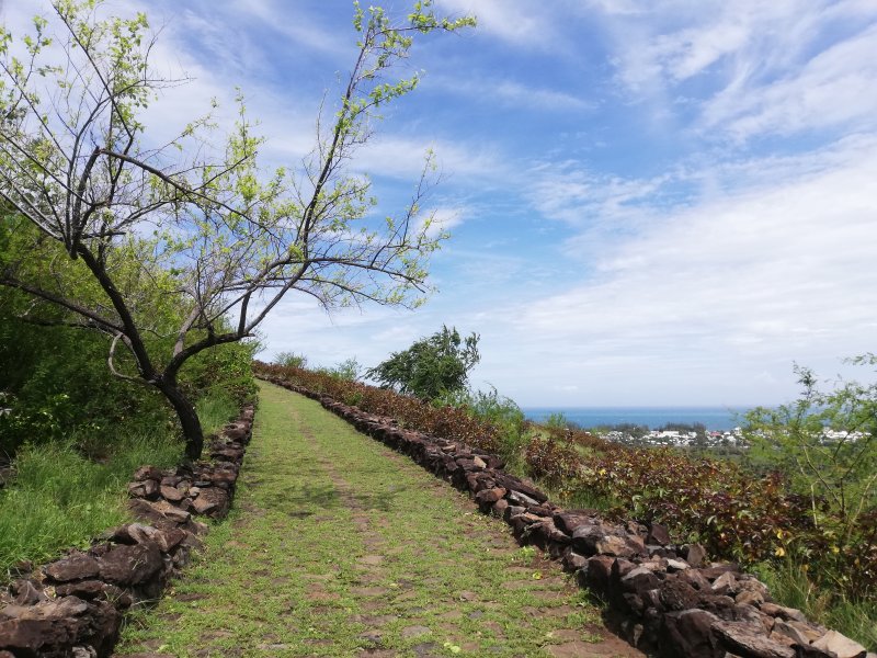 Cette sortie dans les hauts de Saint-Paul permet, après la montée du chemin Lougnon, de continuer par une longue boucle pour visiter les alentours de Maison Rouge et de Macabit. Les chemins pavés sont partout. Depuis les débuts de l'occupation de l'île, il était courant de paver de laves plates les sentiers de la région ou de créer de larges pistes pour transporter les cultures vers la ville. Certains ont été oubliés, d'autres sont, petit à petit, remis en état pour le plus grand plaisir des randonneurs qui les parcourent sous le chaud soleil de l'Ouest. Merci à l'Association Bellemène Pavé pour le travail accompli et surtout pour la qualité de ce travail régulièrement entrepris. Il a fallu plusieurs années et des mètres cubes de terre à enlever pour lui donner son aspect actuel. Lire avant de monter le panneau expliquant les différents chemins pavés de la région.