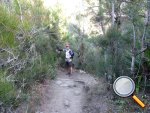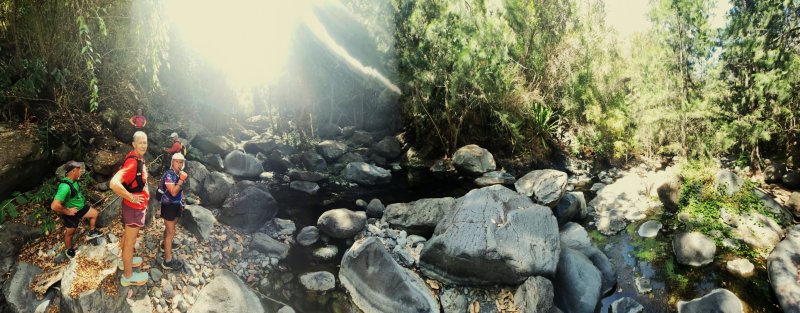 La randonnée débute à Cilaos, au grand parking de la rue des Thermes. Le Sentier des Porteurs commence au parking puis le longe quelques mètres avant de plonger vers le Bras des Etangs par de nombreux lacets et des raccourcis. Les portions planes sont rares mais pourront être agréables au retour (Photo 1). On parvient très vite à l'escalier permettant de rejoindre la RD242. Partir à gauche, franchir le pont et emprunter la route par le sentier qui la longe (Photo 2). Récupérer le GRR2 et entamer la descente vers le Bras Rouge. Le sentier n'est jamais difficile. Il est large, comporte peu de lacets et suit assez souvent la courbe de niveau (Photo 3). Le sous-bois, peu envahi, est agréable et ombragé (Photo 4). On a souvent l'occasion d'admirer certaines parties du cirque. Il faut en profiter car ces panoramas disparaîtront en longeant le Bras des Etangs (Photo 5). On rencontre à mi-parcours quelques lacets courts, des roches créant de hautes marches et même un ancien éboulis (Photo 6). 45 minutes après le départ, on se rapproche de la Ravine Ferrière. 100 mètres avant le gué qu'on ne verra donc pas, le sentier fait un angle droit vers la droite. C'est dans cet angle que débute le petit sentier menant au Bras des Etangs (voir § ci-dessous). Pour être discret il l'est au milieu de ces petits filaos rabougris mais on le distingue tout de même. En quelques mètres on est au bord du rempart d'où l'on peut admirer la cascade de Bras Rouge que l'on domine de plusieurs dizaines de mètres (Photo 7). Profiter de ce spectacle méconnu car on ne repassera pas par cet endroit. Juste en face passe la route de l'Îlet à Cordes qu'on ne remarque qu'au passage d'un véhicule. Le petit sentier se poursuit dans une végétation parsemée de minuscules filaos qui semblent avoir du mal à pousser au milieu de quelques grandes herbes et galaberts. Il se met à descendre assez fortement pour franchir le petit rempart avant de rejoindre le Bras des Etangs. Tous les passages délicats sont équipés de cordes solides qui facilitent grandement la descente (Photo 8). Le bruit des chutes d'eau devient plus important et l'on se retrouve en haut d'un promontoire rocheux d'où l'on aperçoit le torrent. La dernière corde est fort utile pour marcher sur la falaise basaltique glissante (Photo 9). Elle pend dans le vide pour aider à rejoindre les premières roches du lit à deux pas d'une belle cascade et de son grand bassin (Photo 10). On peut facilement s'en approcher si le basalte n'est pas trop glissant (Photo 11). L'accès au bassin est difficile mais possible sans corde en descendant en rive gauche (Photo 12). Mais le but de la boucle est de remonter le torrent et non de le descendre. Entamer cette remontée de rivière de deux heures en cherchant toujours les meilleurs passages. De courtes escalades seront nécessaires (Photo 13). Après quelques minutes de marche, on rencontre une première chute bordée de rochers qui se franchissent aisément en rive droite (Photo 14). Le cheminement le long des rives est possible assez souvent (Photo 15). Une grande partie du trajet s'effectuera les pieds dans l'eau, sur les roches qui encombrent le lit (Photo 16) ou sur des parties basaltiques qui peuvent s'avérer glissantes (Photo 17). On rencontre à chaque instant des curiosités de la nature qui égayent cette remontée de rivière pour les randonneurs peu habitués à ce genre d'exercice. Les coulées ferrugineuses ou les racines de filaos malmenées par les crues donnent de belles occasions de photos (Photo 18). La vallée est assez large même si le bras traverse des zones de petits canyons (Photo 19). On ne compte plus les petites chutes qui donnent du charme à la balade aquatique (Photo 20). Une bonne partie de la sortie s'effectue à l'ombre des filaos qui tentent au mieux à résister à l'assaut de l'eau (Photo 22). Plus haut, le sol devient plus plat et le ruisseau se calme à l'approche des cascades (Photo 23). Ces cascades, qui peuvent se visiter depuis l'amont en partant des Anciens Thermes, ont été modifiées par des travaux à l'époque où les thermes fonctionnaient encore. La première se jette dans un grand bassin entouré de hautes falaises infranchissables (Photo 26-1). La suivante, 200 m plus en amont, ne pourra se rejoindre qu'après avoir trouvé le sentier qui permet de l'atteindre (voir § ci-dessous). Pour cela, revenir sur ses pas et emprunter le sentier à partir du gros rocher en rive gauche. Attention, des traces en rive droite indiquent que des randonneurs sont passés par les falaises très dangereuses pour atteindre la cascade suivante. Il est vivement conseillé d'utiliser le parcours en rive gauche qui ne présente aucun danger. Après un très court cheminement, on parvient à un mur ayant servi de barrage puis à la cascade semi-artificielle (Photo 26-2). Traverser à gué à la cascade puis emprunter le large sentier fréquenté qui permet de rejoindre les bâtiments (Photo 27). Ne pas manquer, en l'empruntant, une autre cascade également modifiée de main d'homme et surtout ces magnifiques concrétions ocre sur lesquelles coule une eau tiède ayant sans doute conservé ses vertus thérapeutiques et thermales (Photo 28). Une minute après ces concrétions, on se retrouve à contourner les thermes et remonter à la RD242 par la piste. Prendre à droite puis emprunter à nouveau le Sentier des Porteurs pour rejoindre le parking à Cilaos.