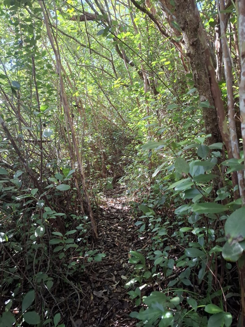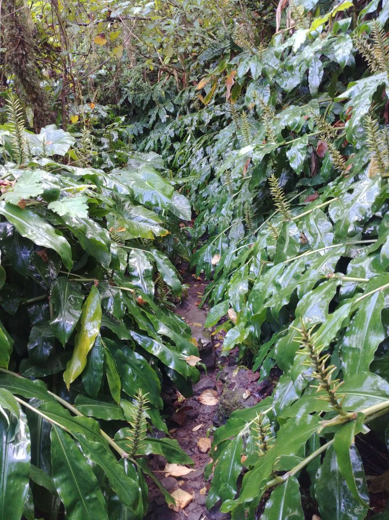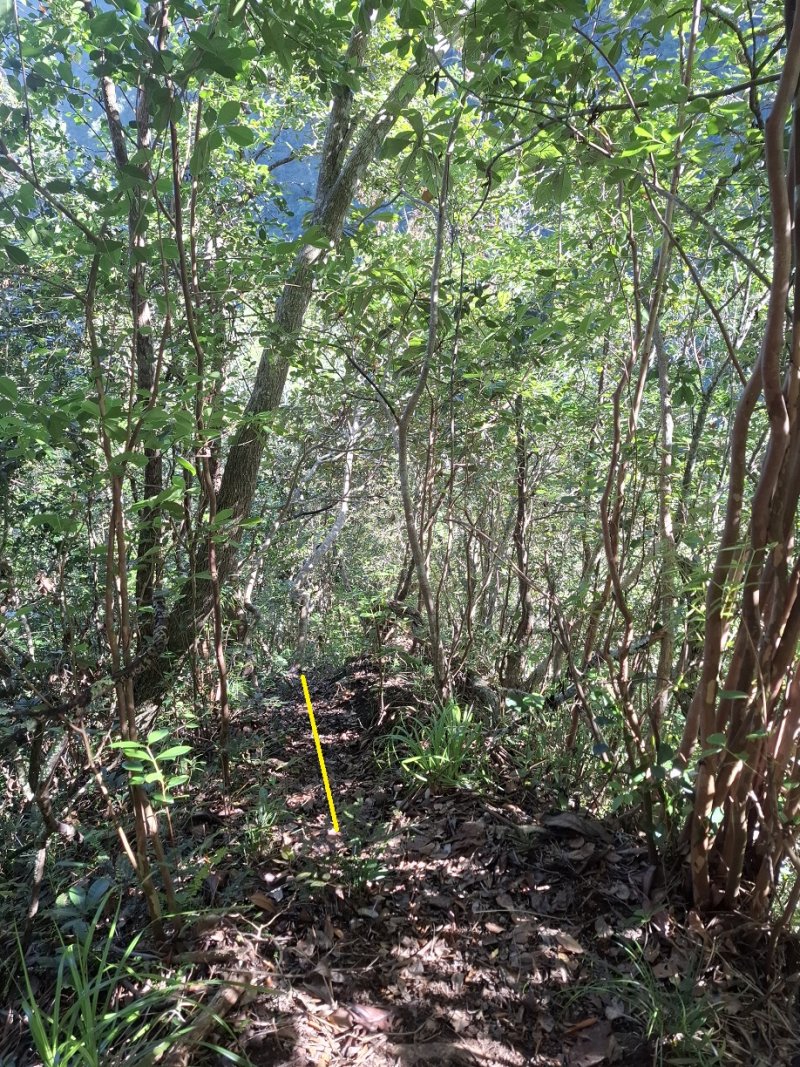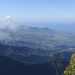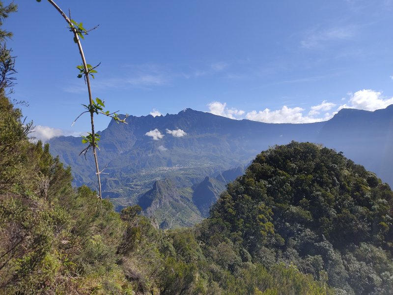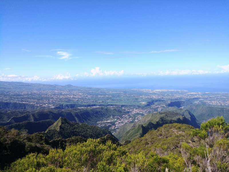 La randonnée débute à l'école primaire de Bras Long, en face de l'EHPAD. La jonction avec le sentier Bayonne, par quelques montées sur route, permet de s'échauffer avant d’entamer la très longue montée vers le Dimitile. Le quartier de Grand Fond Extérieur est assez peu urbanisé et la marche s'effectue sereinement même s'il faut se pencher vers l'avant dans les parties les plus pentues (Photo 1). Au parking pouvant accueillir une demi-douzaine de véhicules, il n'y a plus de départ pour le sentier Bayonne car il a été déplacé plus au Sud. Emprunter alors le sentier du Coteau Sec qui débute par une pente très forte dans les pierres et restes d'escaliers effondrés avec de très hautes marches (Photo 2). Pas de crainte à avoir même si l'on peut penser s'éloigner du Bayonne. On le débusque un peu plus loin sous les filaos. Partir à droite en longeant une rambarde en bambou (Photo 3). Il est moins large que le sentier du Coteau Sec, comporte peu de difficultés et chemine à flanc de falaise ou en ligne de crête jusqu'à un pylône électrique situé au bord du sentier historique (Photo 4). Partir à gauche et entamer la montée de plusieurs heures en prenant dès le départ un rythme adapté à l'effort. Le sentier, assez fréquenté malgré sa fermeture officielle, est large dans une végétation peu entretenue. Les lacets sont fréquents et permettent de diminuer un peu la pente (Photo 5). On arrive facilement, en une demi-heure, au Plateau Raisin, aisément reconnaissable à son sentier passant sous les jamrosats qui poussent si serrés que la lumière du jour a beaucoup de mal à pénétrer. Plus on s'élève, plus les panoramas s'agrandissent de tous côtés. On aperçoit la côte, les coteaux parallèles au sentier, la région des Makes vers la Fenêtre et les remparts des Bénares mais surtout les pointes en direction du Dimitile qui donnent très vite le ton de ce que sera le reste de la montée (Photo 6). Le sentier est toujours correct même s'il n'est pas très large par endroits. On rencontre à peu près tous les types de terrain : zones herbeuses, caillouteuses, terreuses, moussues, humides, bordées de fougères en passant des jouvences aux longoses ou dans les éternels goyaviers ou jamrosats (Photo 7). La pente est constante et les portions de plat très rares (Photo 8). Le sentier est autant en corniche qu'en ligne de crête (Photo 9). Les araignées se plaisent sur le bord des remparts où de grandes toiles peuvent accrocher le vêtement si on est le premier à passer. Ne pas hésiter à se retourner pour profiter des magnifiques panoramas allant jusqu'à l'océan (Photo 10). Le sentier passe souvent le long de l'arête proche du précipice dominant le Petit Serré dont on aperçoit les maisons à l'ombre en regardant vers le Bras de Cilaos. Les sensations de vertige sont rares en raison de la végétation toujours présente (Photo 11). Quand on peut voir la moitié du Cirque de Cilaos, les cryptomerias de la Fenêtre des Makes en face ou une grande partie de la route sinueuse qui rejoint Cilaos, le plus gros de la montée directe est terminé. En revanche, débutent alors une série d'une demi-douzaine de descentes et remontées successives. On utilise souvent des lignes de crêtes dénudées où la trace est de très bonne qualité (Photo 12). Les branles de petite taille facilitent les panoramas qu'on ne quitte jamais (Photo 13). Après 2h50 de montée constante, on atteint un passage un peu vertigineux mais qui a été récemment protégé d'une rambarde (Photo 14). Le sentier quitte parfois l'arête pour emprunter le flanc du rempart mais les montées ne disparaissent pas pour autant. Les points de vue sur Cilaos se multiplient. Il faudra pourtant remonter encore pour redescendre avant la dernière ascension menant au Dimitile. On rencontre quelques éboulis dont un important qu'il faut délaisser et poursuivre sur le sentier de plus en plus difficile à deviner (Photo 15). Les belles portions creusées dans le sol et maintenues par des marches souffrent de plus en plus (Photo 16). Quand on peut voir le Bonnet de Prêtre et le Sommet de l'Entre Deux, il ne reste plus que deux fortes montées où des échelles permettent de passer les pentes les plus abruptes (Photo 17). Les points de vue grandioses sur Cilaos méritent quelques haltes pour se régaler du paysage et souffler un peu (Photo 18). Les premiers tamarins des Hauts annoncent enfin l'arrivée proche du sommet. Quand on profite des panoramas sur Cilaos on est impressionné par la verticalité du rempart en direction de l'Îlet à Calebasse (Photo 20). Quelques barrières protègent du vide avant de se diriger vers le point de vue classique (Photo 21). Après un arrêt à la table d'orientation pour situer les principaux sommets ou îlets, la jonction avec le sentier de la Grande Jument ne prend que quelques minutes. Les jouvences sont plus fréquentes et plus touffues que lors de la montée mais le sentier reste visible. Plus bas ce sont les sabres qui bordent le sentier (Photo 22). Ne pas marcher le nez en l'air car le sentier est étroit et le précipice très vertical. Heureusement la végétation est assez touffue pour freiner une éventuelle chute hormis à la verticale des sources du Grand Bras. On traverse de longues portions recouvertes de branles verts sur un sol rouge et glissant (Photo 23). On atteint rapidement la jonction des Sentiers du Zèbre et de la Grande Jument. Celui du Zèbre est plus boueux et comporte plusieurs lacets dans les bois de couleurs avant d'arriver au départ du Sentier Marron (voir § ci-dessous pour le trouver sans difficulté). La plongée sur ce sentier est immédiate et violente (Photo 24). Le sentier n'est pas très visible mais instinctif. Les marches dépassent le mètre de hauteur et les racines ou arbustes sont indispensables (Photo 25). Après une centaine de mètres très techniques, le sentier devient presque de bonne qualité et le reste 