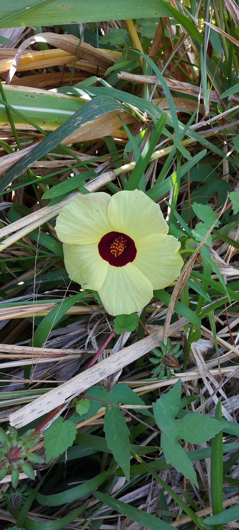 Avant de rejoindre le bocage, on peut s'éloigner du sentier pour en trouver un autre, plus discret qui débute à la première touffe de bambous (Photo 20). La végétation est luxuriante (Photo 20). Le sentier est étroit et difficile à suivre mais on peut se rapprocher de la petite rivière aux calmes (Photo 21). La trace se poursuit vers l'aval mais la végétation a beaucoup trop envahi les lieux et on perdrait du plaisir à poursuivre. Au retour, après avoir remonté le sentier, il est également possible de partir sur la gauche et de suivre la piste laissée au début pour effectuer une boucle dans les cannes (circuit violet sur la carte de la photo 26). Cela rallonge en créant une boucle mais attention tout de même aux chiens à moitié fous qu'on trouve à la première case : le bâton s'avère même nécessaire. On retrouve sur la totalité du rajout ces grands champs de canne à sucre sur des pistes faciles et presque plates (Photo 25). Ce supplément, pourtant agréable, n'a pas été intégré au profil ci-dessous.
