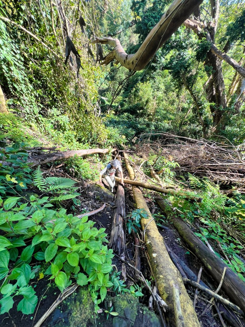 La randonnée débute sur le bord de la route du Bocage où une grande propriété entourée d'un parc semble avoir été un peu remise en état. Si on décide de poursuivre au retour par les champs de canne, se garer après le croisement vers le Lotissement Bocage New York (voir carte). Cette option est conseillée car il est plus facile de stationner qu'au plus près de la propriété où des roches ont même été mises sur le côté pour dissuader, tout comme des pancartes de propriété privée. On est dans les cannes depuis un bon kilomètre et on ne les quittera plus jusqu'à l'orée du bois qui pousse sur les rives escarpées de la Grande Rivière Saint-Jean. Se rapprocher du portail de la propriété. Une route part sur la gauche (Photo 1), une autre, sur la droite. Prendre celle de droite et longer la clôture de la propriété. Plusieurs pistes partent ça et là (Photo 2). Rester au plus près de l'enceinte et filer sur la gauche pour contourner une petite ravine par un lacet dans les hautes herbes (Photo 3). Il passe au plus près de bâtiments délabrés du Bocage avant de partir sur la droite (Photo 4). Plus loin, la piste file tout droit et on a envie de rester dans ce champ qui procure quelques panoramas vers la mer (Photo 6). C'est pourtant celle de gauche qui amènera plus sûrement à la lisière (Photo 7). Ne pas longer cette lisière mais chercher tout de suite le départ. Le sentier qui descend vers la cascade est assez bien marqué et ne peut se manquer, près d'une vieille tôle ondulée. La descente est courte et alterne parties un peu raides et plates sous de grands arbres qui procurent de l'ombre (Photo 8). Prendre tout son temps pour les admirer même si le sol est parfois recouvert de longoses (Photo 10). Certains spécimens ont atteint des tailles très respectables (Photo 11). On entend le bruit de la chute avant d'arriver à de grosses touffes de bambous (Photo 13). Le bassin qu'on devinait déjà du haut du sentier se présente (Photo 14). Le bruit de la chute, lui, était perceptible depuis les champs de cannes. La cascade n'est ni très haute, ni très forte mais le cadre rocheux qui l'entoure est très agréable (Photo 15). L'eau transparente invite aussitôt à la baignade qui peut s'effectuer sans danger à condition de ne pas trop approcher le pied de la chute. Une plage de galets peut même accueillir un pique-nique ou des jeux d'enfants (Photo 16). De hautes falaises bordent l'ensemble (Photo 17). Comme la randonnée est très courte on peut donc rester ici à loisir à admirer ce superbe endroit à quelques encablures de Saint-André. Attention aux moustiques présents une bonne partie de l'année.