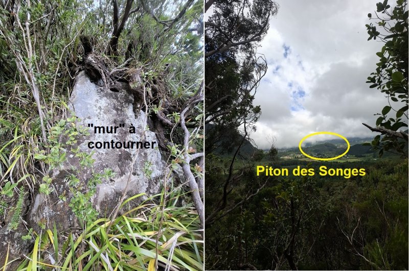 La randonnée commence à la Petite Plaine et peut se coupler avec une autre présentée alentour. Le sentier grimpe d'abord doucement en rive gauche du Bras Noir parmi les goyaviers qui envahissent de plus en plus la forêt de Bébour ou de Bélouve. Il n'est pas évident à découvrir de prime abord mais en gardant à l'esprit qu'il est proche de la rive droite et que des prairies privés empêchent de partir trop loin, on le trouve sans beaucoup d'hésitations. On peut débuter par le lit du Bras Noir en marchant dans les herbes. S'il y a beaucoup d'eau, partir vraiment en rive droite (Photo 1). Le sentier est en très bon état et aucune chance de s'égarer puisqu'il suit sans discontinuer le tuyau de transport de l'eau captée dans la falaise, à la fin de la première partie (Photo 2). Echelles, cordes, passages sur racines ou étroits, quelques rares sensations de vertige sont les ingrédients de cette forte mais courte montée à flanc de falaise basaltique (Photo 4). Les paysages sur la Vallée du Bras Noir ou sur la falaise sont étroits mais très beaux (Photo 5 et 6). Durant la montée, ceux sur la cascade sont impressionnants et font craindre le vertige lorsqu'on s'en approchera (Photo 7). Le sentier est étroit, glissant et souvent masqué par les jouvences (Photo 8). Heureusement les passages délicats sont sécurisés par des câbles d'acier (Photo 9). On arrive en sueur aux falaises rocheuses proches des captages (Photo 10). Le coin est très humide et des petites sources jaillissent de partout (Photo 12). On rejoint le premier captage puis au deuxième quelques secondes plus tard (Photo 11). Après avoir profité des vues sur le bassin 60 mètres plus bas il suffit de rebrousser chemin pour retrouver un sentier aperçu en montant et le prendre à droite pour rejoindre très vite le fond du Bras Noir afin de le remonter vers la haute cascade. Le cheminement en période sèche est très aisé jusqu'au bassin, sur de gros rochers entourés d'arums (Photo 18). Attention cependant car ils sont gros et acérés, d'autant plus dangereux s'il a plu. Les eaux sombres constituent un excellent miroir qui peut donner lieu à de beaux clichés de reflets dans l'eau (Photo 19). Le cirque, vu d'ici, est impressionnant et on aperçoit plus haut le tuyau passant dans le vide près du sentier emprunté 30 minutes plus tôt (Photo 17). La falaise tombant à la verticale est infranchissable. Sa base est criblée de petites grottes difficiles à atteindre (Photo 20). Il faut alors reprendre à nouveau le même itinéraire mais ne pas emprunter le même sentier de remontée pour pousser jusqu'à la cascade en aval, très originale, qui se précipite par un siphon dans deux gouffres sombres et inquiétants (Photo 14 et 15). Les pitons plantés dans le rocher indiquent que tout le monde n'est pas impressionné par ces lieux insondables à l'œil. Ne pas manquer, avant de partir, la nature morte constituée de deux bois de rempart qui se croisent au-dessus des gouffres (Photo 13). Bien repérer sous le bois de rempart en rive gauche le très discret sentier qui remonte en forte pente rejoindre le sentier du captage, à deux pas de la première échelle rencontrée en montant. Les mains sont nécessaires mais les racines sont parfois bien disposées et l'escalade s'effectue sans danger. On reprend alors la descente le long du tuyau en guettant, à l'approche de la route, la petite sente qui dévale dans les racines vers les berges basaltiques du Bras à un premier bassin alimenté par une petite chute d'eau (Si on le manque ou si le niveau de l'eau est trop haut, il faudra rejoindre la route puis le départ du sentier botanique de la Petite Plaine). A partir de ce point, il faut toujours rester en rive droite et monter au plus près du ravin. La pente est très forte par moments et des passages discrets permettent de rejoindre les berges et surtout les cascades. Le sentier n'est pas toujours évident car il est surtout pratiqué par les canyonistes pour rejoindre les chutes les plus hautes. La carte ci-dessous prévoit un arrêt à la dernière montée qui suit une échelle orange placée presque à l'horizontale. Plus haut ce n'est plus de la randonnée et les tronçons qui restent sont laissés aux professionnels ou aventuriers responsables qui décident de poursuivre. Le retour au parking est agréable sur une courte portion de Sentier Botanique qui traverse le bois de cryptomerias très connu des amateurs d'accrobranche de Forestia avant son démantèlement. C'est désormais Acroplaine qui occupe une autre partie de la forêt de cryptomerias.