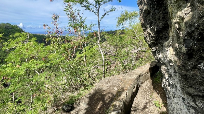La randonnée débute 10 mètres en amont du café en empruntant un sentier marron (facilement reconnaissable à ses immondices !) près de la grille d'un terrain parfois ouvert mais interdit de passage aux piétons. On arrive très vite à deux départs de sentiers. Le mieux est de débuter la randonnée en longeant tout d'abord le canal supérieur en partant immédiatement à gauche. On marche le plus souvent dans le fond du canal à sec (Photo 1). S'il a de l'eau, ce qui arrive de moins en moins, marcher sur la margelle mais gare au vertige pour certains (Photo 2). On se retrouve très vite à l'entrée d'un premier tunnel (Photo 3), puis d'un second. Une lampe peut s’avérer utile mais non indispensable car il suffit de marcher en tâtant le plafond avant d'apercevoir très rapidement la lumière de l'autre côté. Plus loin, c'est une faille étroite qu'il faut emprunter (Photo 4). Un peu partout, le canal surplombe le vide et il faut prendre le temps d'étudier le travail impressionnant réalisé par les ouvriers de l'époque. Des arbres aux racines interminables qui tombent du haut de la falaise côtoient des lianes enchevêtrées (Photo 6). Repérer au passage les sentiers qui redescendent vers le canal inférieur et la Bassin des Aigrettes. D'autres sentiers, moins pratiqués et parfois dangereux, descendent vers la grande cascade, officiellement fermée de hautes grilles infranchissables. Le bruit de l'eau devient plus fort et on se retrouve en haut de la cascade des Aigrettes (Photo 12). S'il y a peu d'eau, on peut franchir la ravine et marcher sur les rochers pour dominer la chute et son bassin (Photo 13). Plus loin, quelques passages très rocheux imposent de faire un peu d'escalade (Photo 7). On arrive enfin au bassin Malheur entouré de hautes falaises friables (Photo 8) et dominé par la route des Tamarins. Ce bassin a beaucoup d'eau malgré le manque de cascade pour l'alimenter. Le courant provient en réalité d'une importante résurgence d'eau très claire (Photo 9) sous les rochers. Une fois le plongeon ou le bain effectué, reprendre le sentier en sens inverse et descendre à pic vers le canal inférieur pour rejoindre la ravine. Un sentier comportant de courts lacets et un sol très glissant permet de rejoindre en quelques minutes (Photo 11) un canal le plus souvent rempli d'un courant d'eau clair et frais (Photo 16). En partant sur la gauche et en remontant le courant du canal on parvient à une première grille, usée par les passages et plus loin, une seconde beaucoup plus difficile à franchir. Pourtant, en regardant à travers, on voit des gens qui se promènent ou se baignant !! Randopitons ne veut pas inciter les marcheurs à enfreindre les règles et chacun prendra ses responsabilités pour se rendre au pied de cette magnifique cascade (Photo 14). On peut voir la cascade depuis les grilles (Photo 15). La troisième chute du Bassin des Cormorans se rejoint en longeant le second canal (Photo 17). On domine le bassin qu'on devine au bruit de la chute avant de l'apercevoir à travers les branches (Photo 19). Descendre jusqu'à la touffe de bambous proche du bassin en passant près d'un "repaire" qui sent parfois une bonne odeur de fumée qui n'est pas encore légalisée, ce qui ne saurait tarder ! Il faut préciser que ce dernier bassin devient de moins en moins attrayant depuis quelques années en raison de son manque d'entretien, de la boue ou des cailloux glissants. Une fois cette troisième visite terminée, reprendre en sens inverse jusqu'au croisement du sentier qui remonte au point de départ (Photo 24). La pente, pourtant moyenne, fera vite oublier la fraîcheur des lieux !
