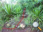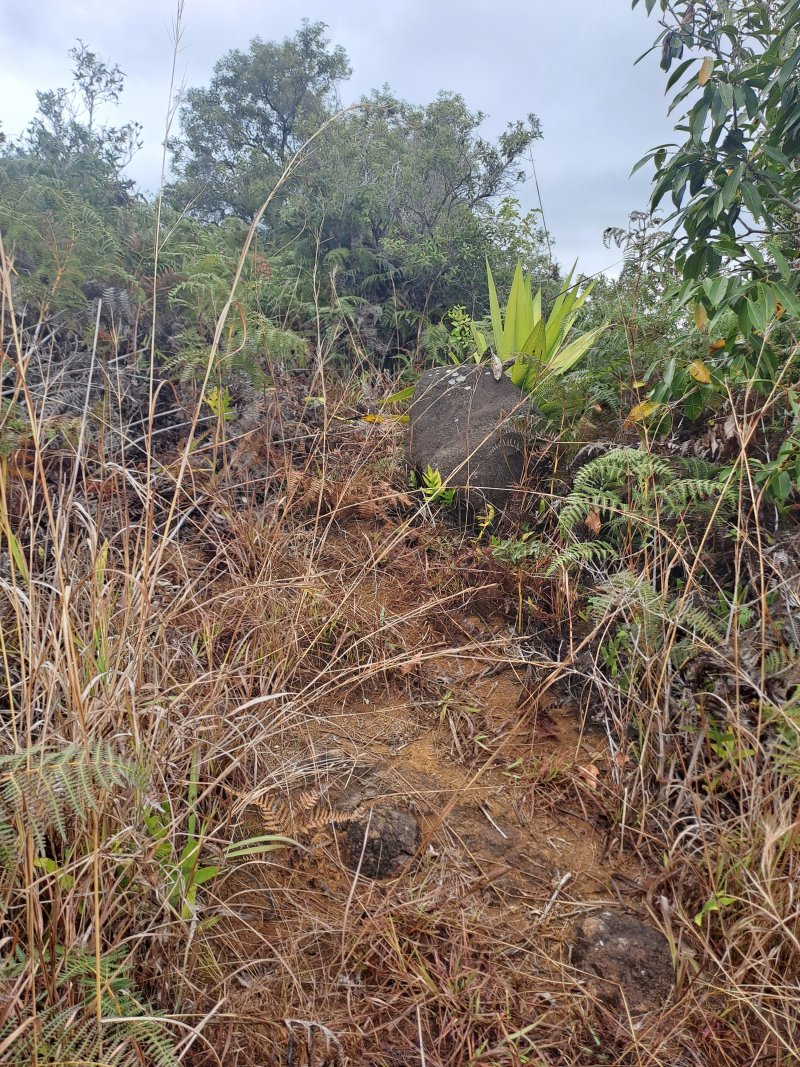 La randonnée débute au lotissement de la Grande Montagne, au très fréquenté sentier Kalla, usé par les joggeurs de la région. (Photo 1). On monte régulièrement dans un paysage desséché sur des pistes, sentiers de raccourci ou belles portions pavées (Photo 2). Il y a aussi, hélas, quelques parties recouvertes de pierres qu'il faut enjamber (Photo 3). Après une demi-heure de marche, on rejoint un croisement où une pancarte qui a disparu indiquait, il fut un temps, un point de vue sur la Grande Ravine des Lataniers. On peut filer tout droit et débuter dans les fougères le sentier Joncourt qu'on ne quittera plus jusqu'au Sentier des Lataniers, 5 km plus haut, ou prendre à gauche vers l'agréable point de vue (conseillé - Photo 6). Au point de vue, le sentier descend vertigineusement vers le hameau près de la ravine mais un autre part sur la droite et longe le rempart avant de rejoindre, plus haut dans les fougères, le sentier Joncourt laissé au croisement. Quelques encouragements peints en créole sur les roches plates égayent la montée (Photo 4). La marche est aisée, le sentier visible et les balises ou traces de peinture assez espacées pour ne pas s'égarer. On quitte les fougères pour entrer sous le couvert sombre des jamrosats avant de rencontrer le tronçon recouvert de goyaviers serrés (Photo 7). Ne jamais perdre de vue les balises ou la trace elle-même qui diminue au fur et à mesure que les troncs grossissent (Photo 8). On découvre une ancienne piste couverte de végétation sans qu'on sache vraiment où elle va et d'où elle vient (Photo 9). Puis ce sont les bois de perroquets qui constituent l'essentiel de la forêt (Photo 10). Le sentier est assez facile à suivre au milieu de fougères (Photo 11). Quelques pentes un peu plus fortes imposent de se pencher vers l'avant (Photo 12). Plus loin débute une assez belle forêt de bois de couleurs comportant des spécimens tortueux dont un incendié qui sert de repère à un changement d'itinéraire (Photo 14). Il faut partir à gauche aussitôt après ce bois mort qui disparaitra dévoré par les xylophages (Photo 15). En effet, le sentier qui remontait le rein est trop obstrué et la déviation, marquée de peinture orange, effectue un contournement par le nord avant de retrouver le Joncourt, toujours dans les bois de couleur. Si jusque là tout allait bien, les premières fougères de 2 à 4 mètres de hauteur font leur apparition (Photo 16). Il faut se préparer à dégainer le coupe-coupe car le sentier disparaît souvent sur de longues distances (Photo 17). Seules les traces de courageux pionniers ainsi que les fougères coupées à 50 cm du sol indiquent qu'on est sur ou proche du sentier (Photo 18). Quelques coups d'œil sur la carte du GPS rassurent car la trace rouge du satellite recouvre la noire de la carte. Le bras travaille plus que les jambes et la vitesse de progression est réduite au minimum. Il faut parfois escalader des monceaux de fougères couchées ou pire, passer en-dessous pour gagner en énergie. Encore une fois le GPS rassure en montrant la distance qui nous sépare du Sentier des Lataniers. Depuis ce dernier, difficile de voir d'où on vient, surtout si le brouillard se mêle de la partie (Photo 20). Ce dernier, pourtant très étroit au moment de la jonction, semble un GR tellement les deux dernières heures ont été incertaines. Comme le Sentier des Lataniers est assez plat, on a presque envie de courir pour rattraper le temps perdu (Photo 21). Il faut pourtant garder à l'esprit qu'il reste près de 20 km à parcourir avant de rejoindre le véhicule. La descente vers Grand Coin sur le sentier étroit et glissant peut donner l'occasion de belles chutes si la semelle mord sur les millions de jouvences (Ageratina riparia - Orthochifon ) qui recouvrent le sol et ne peuvent porter le pied (expérience vécue !!! – (Photo 22). On retrouve la civilisation lors de la longue traversée de Grand Coin et Dos d'Ane pour rejoindre l'église du village (Photo 23). Aucun raccourci ne permet d'éviter les nombreux lacets de la route. A l'église, le plus difficile est fini et on est à mi-parcours. Une montée vers la piste de départ des parapentes puis le Sentier de Bord bordé de rochers (Photo 24) puis la courte descente amènent en peu de temps à la D1. Attention à la circulation avant de rejoindre le Chemin Ratineau qui tourne dans tous les sens et paraît interminable jusqu'à la jonction du sentier Kalla (Photo 25). On accède à la Ravine Marquet par une courte et forte descente où les marches dépassent parfois les 80 cm. La remontée vers la grotte (Photo 27) n'est guère meilleure (Photo 26). Inversement toute la boucle qui contourne ou longe la Ravine de la Mare est agréable et reposante à l'ombre sous les grands poivriers. On rejoint enfin le croisement pris longtemps auparavant puis on descend le Sentier Kalla jusqu'à la Grande Montagne qu'on atteint avec un grand soulagement.