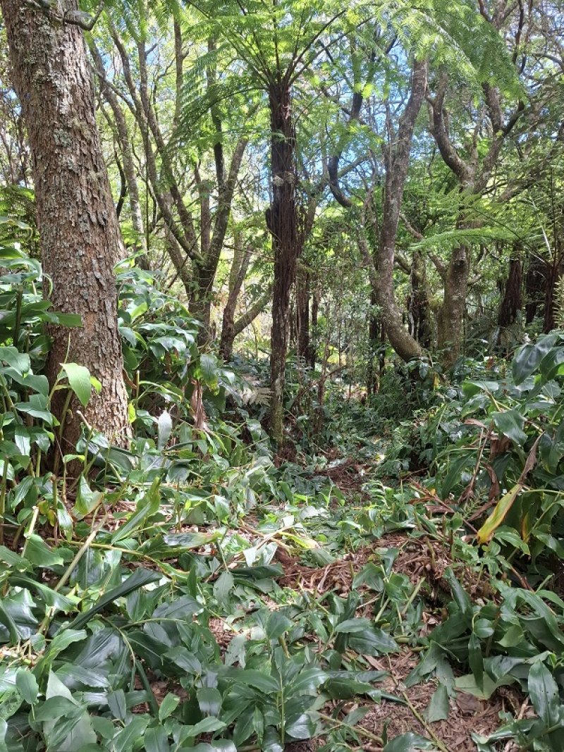 On reste quelques temps sur la même courbe de niveau avant de franchir aisément la ravine Laforge. Dans la deuxième partie s'étend un des plus beaux tamarins qu'il m'ait été donné de voir avant de retrouver les cryptomérias et une piste de débardage. La troisième partie avant de retrouver la piste VTT Papangue est plus encombrée et nécessite de franchir la ravine non nommé au droit de la ravine du Trou.