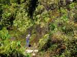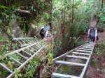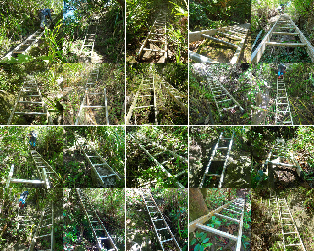 Voici rassemblées les 25 échelles en aluminium situées en aval de la première métallique peinte en orange (non comprise sur le cliché). Cette échelle orange marque la fin des escalades et l'arrivée proche du point de vue sur la Rivière. Les échelles sont très souvent installées par deux et on monte de l'une sur l'autre sans toucher le sol. Il faut dire que la pente s'y prête fort bien et elles diminuent grandement l'effort à fournir pour rejoindre la Forêt de Bébour. A la descente, il vaut mieux se tourner vers l'échelle que face au vide pour éviter les accidents. Une 27ème échelle se situe sur le sentier de Takamaka pour franchir une ravine.