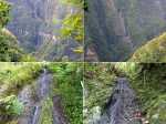 La randonnée débute au parking de l'usine EDF où l'on peut prendre quelques minutes pour se régaler des paysages alentour depuis un belvédère entouré de panneaux pédagogiques et vestiges (Photo 1). Attaquer le sentier qui longe quelques rambardes et des barres rocheuses en suivant la courbe de niveau jusqu'au départ du Sentier du Bras Patience. On distingue au loin de magnifiques cascades alimentant la Rivière des Marsouins tout en côtoyant quelques pisse en l'air qui humidifient le sentier (Photo 2). Laisser le sentier qui file vers la droite et entreprendre la plongée assez technique vers la Rivière des Marsouins sur un sol parfois rocheux et glissant. Les lacets sont nombreux et serrés en forte descente. Le passage est large et très peu encombré depuis le dernier nettoyage (Photo 3). Pas de difficulté particulière hormis quelques ornières, hautes marches ou passages pierreux (Photo 4). La pente s'assagit puis le sentier franchit des petits affluents de la Rivière sur des passerelles qui évitent de se mouiller (Photo 6). On passe ainsi trois de ces pontons métalliques avant de parvenir au Bras Patience. L'étroit canyon se traverse sur un pont étroit. S'y arrêter pour apprécier le spectacle de la haute cascade ou du torrent vers l'aval (Photo 7). Moins de 2 minutes plus tard, la nouvelle passerelle sert de point de départ au sentier remontant vers l'Îlet à Bananes. Il vaut mieux franchir l'ouvrage et partir à droite à l'assaut de la forte pente glissante (Photo 8). Après un virage à droite, la pente ne faiblit pas sur de hautes marches rocheuses. Puis le sentier devient agréable, en faible pente, large et bien nettoyé. On longe souvent le vide mais des milliers de goyaviers ou bois de couleurs protègent d'une chute éventuelle. Quelques rares passages imposent des efforts lors de franchissements rocheux ou de ravines (Photo 9). Ce sentier, qui aura bientôt un siècle, a vu passer des ouvriers, des randonneurs et les habitants de l'îlet Bananes qui ont creusé de véritables fossés par endroits (Photo 10). On longe à un moment un long vestige du câble de téléphérique. La flore est hélas remplacée partout par les goyaviers. Côté faune, on rencontre beaucoup de papillons, quelques oiseaux, des crapauds mais surtout de gros bourdons fonctionnant au kérosène qui ont certainement chassé tout ce qui pouvait vivre dans ces endroits calmes (Photo 11). Heureusement, la zone est peu habitée. Les points de vue sont constants sur la Rivière des Marsouins même s'il n'est pas toujours facile de distinguer les cascades (Photo 12). Cette faible montée suit à un moment un tuyau et amène un peu plus loin au captage récupérant l'eau de ruissèlement tombant de la falaise (Photo 13). Plus on monte et plus le sentier est facile entre les haies de goyaviers (Photo 14). En moins de 2 heures, on parvient à l'Îlet à Bananes. L'endroit qu'on distingue sur les cartes de 1950 a depuis longtemps été dévoré par les vignes, bringeliers et goyaviers (Photo 15). En quittant l'emplacement, on arrive très vite aux premières échelles qui aident grandement à franchir le rempart presque vertical. On a peu le temps de souffler entre elles et certains passages nécessitent deux échelles accolées (Photo 16). Comme il est plus facile de grimper des barreaux que des racines ou roches glissantes, on atteint rapidement la dernière d'entre elles près d'une belle arche végétale (Photo 17). Le sentier traverse ensuite le plateau. La marche se fait à plat sur des portions de racines et parfois de boue (Photo 18). La forêt est moins attaquée par les goyaviers (Photo 19). Quand les bois de couleurs cèdent la place aux branles moussus, les installations du barrage approchent (Photo 20). Partir sur la gauche et rejoindre rapidement la piste n°3. Le point de vue (facultatif) se rejoint en quelques secondes. Les randonneurs peu entraînés peuvent faire demi-tour ici et reprendre la longue descente sur les barreaux d'aluminium en direction de l'usine. Les autres partiront sur la piste en terre rouge un peu défoncée par endroits (Photo 21). Elle remonte légèrement vers la route de Bélouve en traversant la forêt de Bébour peuplée de dizaines de variétés de bois de couleurs qu'on devine facilement au feuillage. Certaines portions goudronnées facilitent la marche. A la route, après la barrière, faire demi-tour ou partir sur la droite pour emprunter le sentier de Takamaka (Photo 22). Attention à l'inversion des temps sur le panneau de l'ONF. Le sentier étroit est boueux mais traverse cette magnifique forêt pour un spectacle unique de mousses, troncs épais, épiphytes et orchidées (Photo 23). Il effectue d'abord quelques dents de scie puis ondule à en faire perdre le sens de l'orientation. Les passages techniques sont rares. Il y a peu de troncs à enjamber ou d'arches imposant de se baisser (Photo 24). Il serait dommage de ne pas pratiquer ce sentier qui traverse facilement une superbe partie de la Forêt de Bébour (Photo 25). Les troncs centenaires sont légion et imposent le respect (Photo 26). Les amateurs se régaleront des belles racines rencontrées même s'il faut marcher dessus (Photo 27). 90 minutes suffisent pour traverser la forêt. Quand on arrive aux derniers caillebotis, on rejoint le sentier pris à l'aller (Photo 28). La descente par les échelles puis le retour jusqu'au barrage Gingembre s'effectue plus vite qu'à l'aller en raison de la descente constante. Le dernier coup de rein permettra de franchir les lacets pour atteindre les installations de l'usine et le belvédère du PK16.
